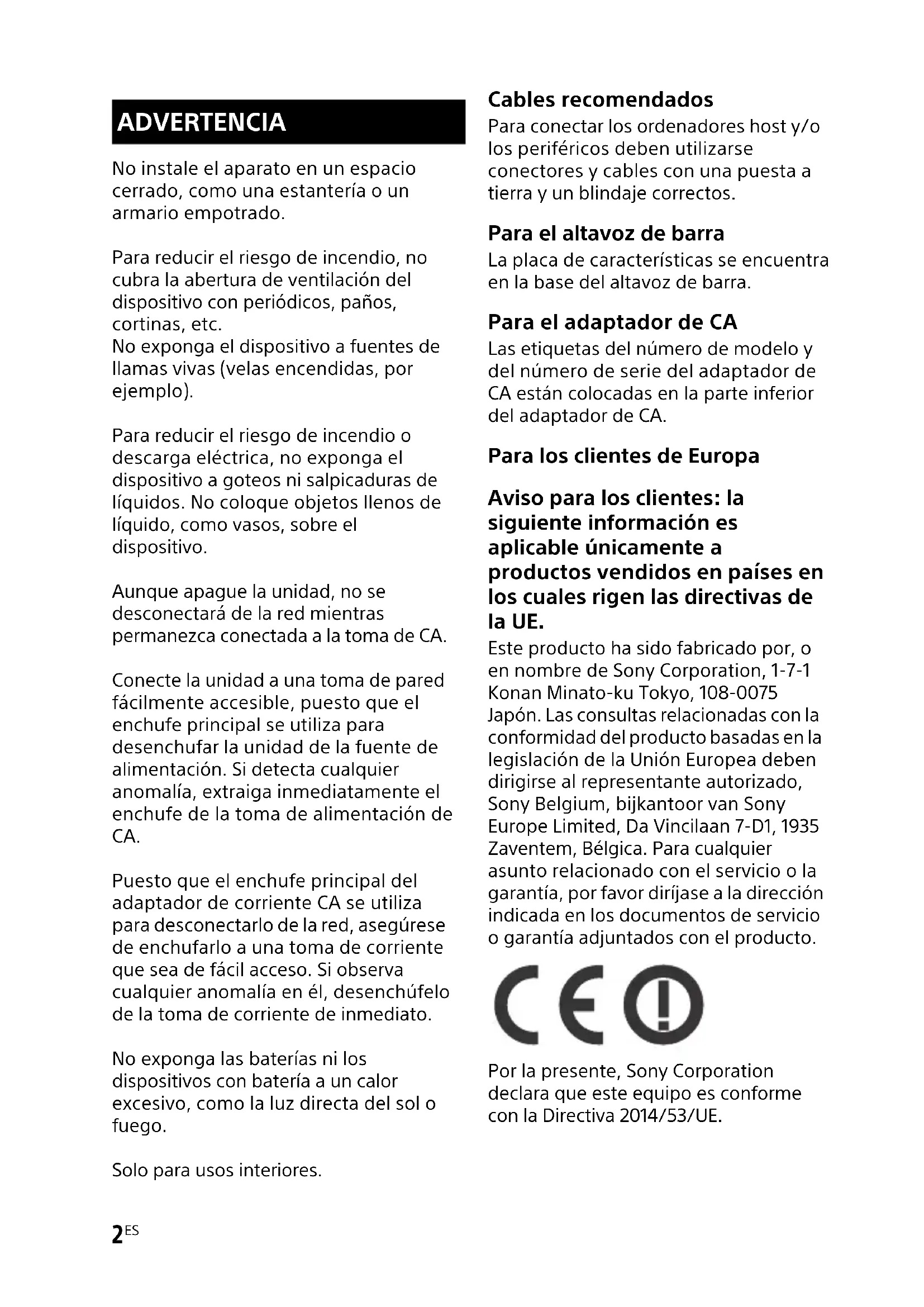 No instale el aparato en un espacio cerrado, como una estantería o un armario empotrado. Para reducir el riesgo de incendio, no cubra la abertura de ventilación del dispositivo con periódicos, paños, cortinas, etc. No exponga el dispositivo a fuentes de llamas vivas (velas encendidas, por ejemplo). Para reducir el riesgo de incendio o descarga eléctrica, no exponga el dispositivo a goteos ni salpicaduras de líquidos. No coloque objetos llenos de líquido, como vasos, sobre el dispositivo. Aunque apague la unidad, no se desconectará de la red mientras permanezca conectada a la toma de CA. Conecte la unidad a una toma de pared fácilmente accesible, puesto que el enchufe principal se utiliza para desenchufar la unidad de la fuente de alimentación. Si detecta cualquier anomalía, extraiga inmediatamente el enchufe de la toma de alimentación de CA. Puesto que el enchufe principal del adaptador de corriente CA se utiliza para desconectarlo de la red, asegúrese de enchufarlo a una toma de corriente que sea de fácil acceso. Si observa cualquier anomalía en él, desenchúfelo de la toma de corriente de inmediato. No exponga las baterías ni los dispositivos con batería a un calor excesivo, como la luz directa del sol o fuego. Solo para usos interiores. Cables recomendados Para conectar los ordenadores host y/o los periféricos deben utilizarse conectores y cables con una puesta a tierra y un blindaje correctos. Para el altavoz de barra La placa de características se encuentra en la base del altavoz de barra. Para el adaptador de CA Las etiquetas del número de modelo y del número de serie del adaptador de CA están colocadas en la parte inferior del adaptador de CA. Para los clientes de Europa Aviso para los clientes: la siguiente información es aplicable únicamente a productos vendidos en países en los cuales rigen las directivas de la UE. Este producto ha sido fabricado por, o en nombre de Sony Corporation, 1-7-1 Konan Minato-ku Tokyo, 108-0075 Japón. Las consultas relacionadas con la conformidad del producto basadas en la legislación de la Unión Europea deben dirigirse al representante autorizado, Sony Belgium, bijkantoor van Sony Europe Limited, Da Vincilaan 7-D1, 1935 Zaventem, Bélgica. Para cualquier asunto relacionado con el servicio o la garantía, por favor diríjase a la dirección indicada en los documentos de servicio o garantía adjuntados con el producto. Por la presente, Sony Corporation declara que este equipo es conforme con la Directiva 2014/53/UE. ADVERTENCIA3