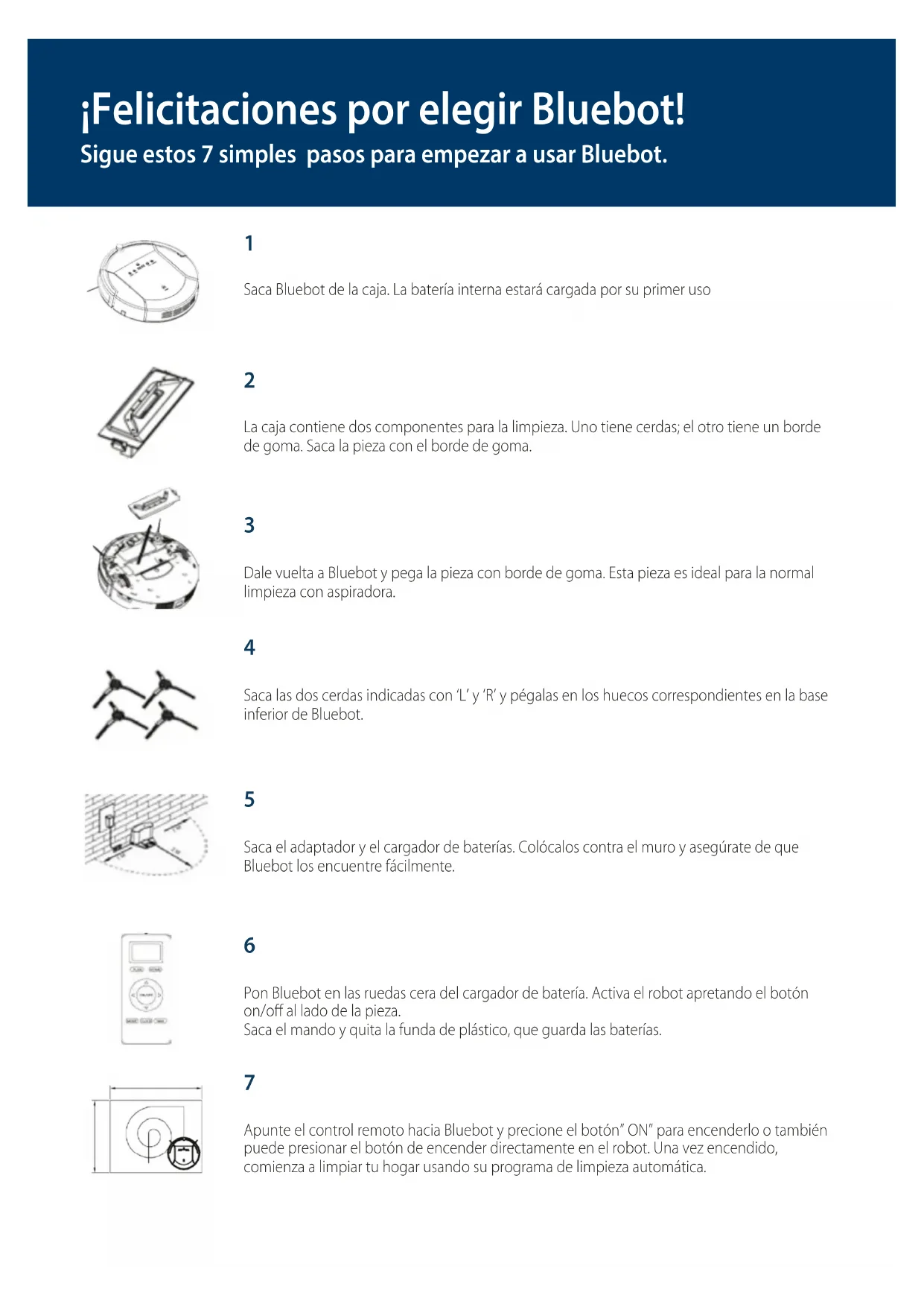 Apunte el control remoto hacia Bluebot y precione el botón” ON” para encenderlo o también puede presionar el botón de encender directamente en el robot. Una vez encendido, comienza a limpiar tu hogar usando su programa de limpieza automática.¿En la caja de Bluebot están incluidas partes de repuesto? Sí, la caja incluye 2 cerdas y un filtro HEPA de más. ¿Cómo limpio el recogedor del polvo? Apaga Bluebot y aprieta el tapón que pone ‘push’. Bluebot se abrirá, permitiéndote quitar el recogedor del polvo. La parte superior del recogedor tiene un pequeño cepillo, que puede ser usado para limpiar el filtro HEPA. Pon atención: el filtro HEPA no debe mojarse. El resto del recogedor de polvo puede ser vaciado al cubo de la basura y (facultativamente) enjuagado con agua. Deja que el recogedor del polvo se seque completamente antes de reinsertarlo en el Bluebot. ¿Qué diferencia hay entre las piezas para la limpieza? La pieza para la limpieza tradicional con el borde de goma se debe usar para la aspiración normal y tiene que ser usada en la mayoría de los casos. La pieza con las cerdas ha sido específicamente optimizada para la limpieza de las alfombras y del sucio excesivo. ¿A qué sirve la cinta magnética? La cinta es el así llamado “limitador de área”. Puede usarse para evitar que Bluebot vaya en zonas específicas de tu casa. Para usar la cinta magnética, antes de la aspiración, extiende la cinta magnética (lado plano por debajo) en el suelo de la zona que se quiere bloquear: el robot reconocerá la cinta y evitará la zona. ¿ Cómo uso el tanque de agua y la fregona? Pega la fregona a la parte inferior del tanque de agua usando la cinta de velcro. Rellena el tanque con agua y una pequeña cantidad de producto detergente. Asegúrate de que el tapón de goma sea completamente sigilado. Dale vuelta a Bluebot y adjunta el tanque de agua arreglando los dos alfileres pequeños y grandes en el robot. Vuelve a poner Bluebot en sus ruedas y enciéndelo. El agua se derramará directamente del tanque a la fregona. ¿Cómo se carga Bluebot? Bluebot volverá a su cargador de batería. Si quisieras cargarlo con antelación, bastará con apretar el botón ‘HOME’ en el mando. Esto ordenará a Bluebot que vuelva a su cargador de batería. Alternativamente, puedes conectar el cable de carga directamente a Bluebot. ¿Cómo puedo adherir la estación de acoplamiento en la pared? La parte trasera de la estación de acoplamiento contiene cinta adhesiva. Puedes elegir si deseas conectar la estación de acoplamiento o no. Para una estabilidad óptima de la estación de acoplamiento se recomienda fijarla contra la pared. FAQSi desea conectar la estación de acoplamiento a una ubicación fija, quite la cinta de protección en la parte posterior y presione la estación de acoplamiento contra la pared. La superficie o la pared debe ser dura, lisa y limpia sin polvo. Por ejemplo: baldosa, aluminio, madera o una superficie de vidrio. De lo contrario podría resultar en una fijación inestable. La cinta adhesiva es extraíble y puede ser reutilizada. ¿Qué programas de limpieza puedo usar? Presione el boton de modo X1,X2,X3,X4,X5 en el control remoto para cambiar entre los diferentes modos de limpieza Modo 1: Limpieza de bordes: El robot comieza a limpiar alrededor de los bordes de las paredes. En la pantalla LCD aparece el modo 1 en la esquina inferior a la derecha. Modo 2: Limpieza de area: 2x2 metros cuadrados en movimientos zig-zag. En la pantalla LCD aparece el modo 2 en la esquina inferior a la derecha. Modo 3: Limpieza aleatoria: El robot limpia en forma aleatoria. En la pantalla LCD aparece el modo 3 en la esquina inferior a la derecha. Modo 4: Limpieza intensiva: En la pantalla LCD aparece el modo 4 en la esquina inferior a la derecha. El robot iniciara el modo de limpieza “MAX” y limpia la habitación o area dos veces. Modo 5: El robot dejara de limpiar y se pondrá en modo de espera. No hay modo 5 en el panel LCD. Donde puedo descargar la aplicacion XSMART? Visite www.blaupunktrobotics.eu for the APP manual. La aplicacion “BluebotXS” esta disponible para los sistemas iOS y android y pueden ser descargados en App store o Google play. ¿Cómo establezco un horario planeado? Solamente puedes programar Bluebot cuando esta encendido o cargando. Programacion en el panel de visualizacion en la unidad del robot. A. Configurar la hora actual del robot ( asegurese de que el robot este en modo de espera o encendido) a. Presione el boton “PLAN” para iniciar el ajuste de la hora actual. El panel de LED le mostrara la hora actual del sistema. b. Acontinuacion, los dos numeros de la izquierda en el panel LED parpadearan. Los dos números de la izquierda significan hora, presione “HOME” para incrementar las horas o “MAX” para disminuir las horas. c. Presione el simbolo Para hacer un cambio de modo y ajustar los minutos, los dos números al lado derecho en el panel de LED parpadearan. Presione “HOME” para incrementar o presione “MAX” para disminuir. d. Presione el simbolo Para guardar la configuración, luego presione “PLAN” para salir (Antes de guardar el ajuste, si pulsa “PLAN” para salir, el ajuste actual no será valido) B. Ajuste del tiempo de programacion (asegurese de que el robot este en modo de espera o encendido) a. Presione “PLAN” y mantengalo presionado por 3 segundos para iniciar la programación, acontinuacion los dos números de la izquierda en el panel de LED parpadearan. b. Presione “HOME” para incrementar las horas o “MAX” para diminuir las horas. c. Presione el simbolo para entrar en el modo ajuste de minutos, los dos números en la parte derecha en el panel de LED parpadearan. Presione el botón “HOME” para incrementar o “MAX” para disminuir. d. Presione el boton Otraves para guardar la configuracion, acontinuacion presione el boton “PLAN” para salir (Antes de guardar el ajuste, si pulsa “PLAN” para salir
