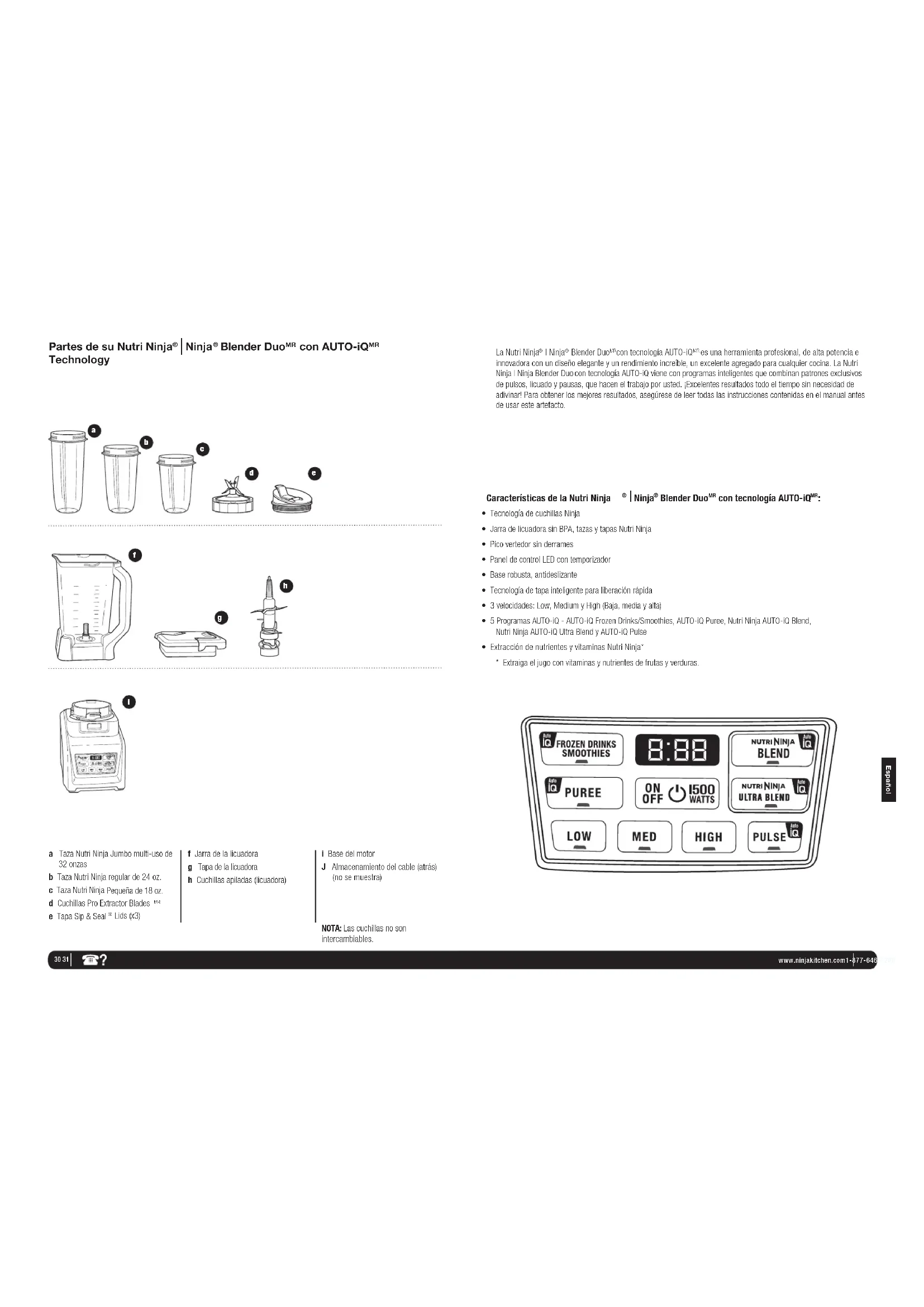 es una herramienta profesional, de alta potencia e innovadora con un diseño elegante y un rendimiento increíble, un excelente agregado para cualquier cocina. La Nutri Ninja | Ninja Blender Duo con tecnología AUTO-iQ viene con programas inteligentes que combinan patrones exclusivos de pulsos, licuado y pausas, que hacen el trabajo por usted. ¡Excelentes resultados todo el tiempo sin necesidad de adivinar! Para obtener los mejores resultados, asegúrese de leer todas las instrucciones contenidas en el manual antes de usar este artefacto.32 33 www.ninjakitchen.com1-877-646-5288 Español Antes de su Primera Utilización CUIDADO: No sumerja la base del motor en agua ni en ningún otro líquido.