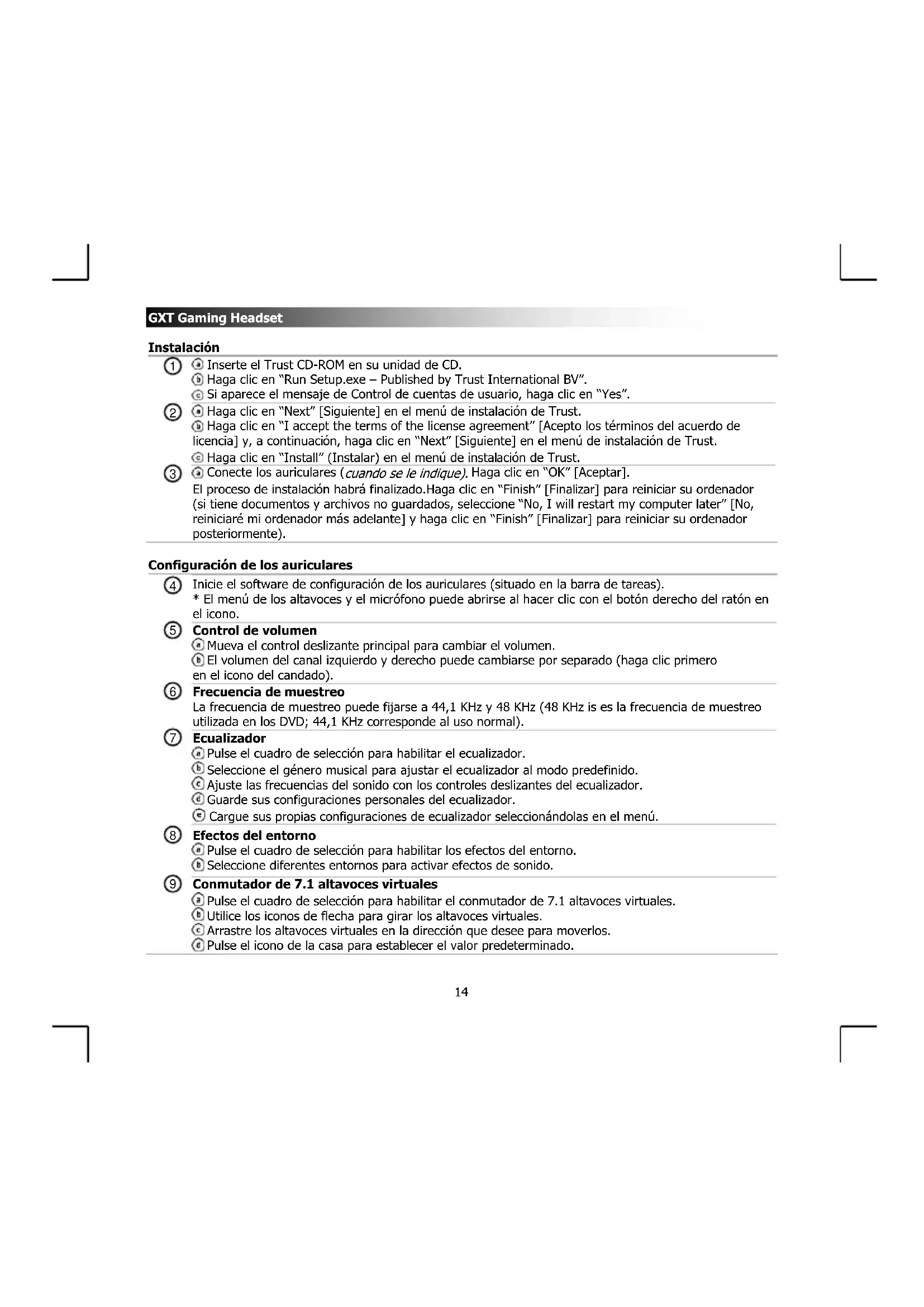 Inserte el Trust CD-ROM en su unidad de CD. Haga clic en “Run Setup.exe – Published by Trust International BV”. Si aparece el mensaje de Control de cuentas de usuario, haga clic en “Yes”. Haga clic en “Next” [Siguiente] en el menú de instalación de Trust. Haga clic en “I accept the terms of the license agreement” [Acepto los términos del acuerdo de licencia] y, a continuación, haga clic en “Next” [Siguiente] en el menú de instalación de Trust. Haga clic en “Install” (Instalar) en el menú de instalación de Trust. Conecte los auriculares ( cuando se le indique). Haga clic en “OK” [Aceptar]. El proceso de instalación habrá finalizado.Haga clic en “Finish” [Finalizar] para reiniciar su ordenador (si tiene documentos y archivos no guardados, seleccione “No, I will restart my computer later” [No, reiniciaré mi ordenador más adelante] y haga clic en “Finish” [Finalizar] para reiniciar su ordenador posteriormente).