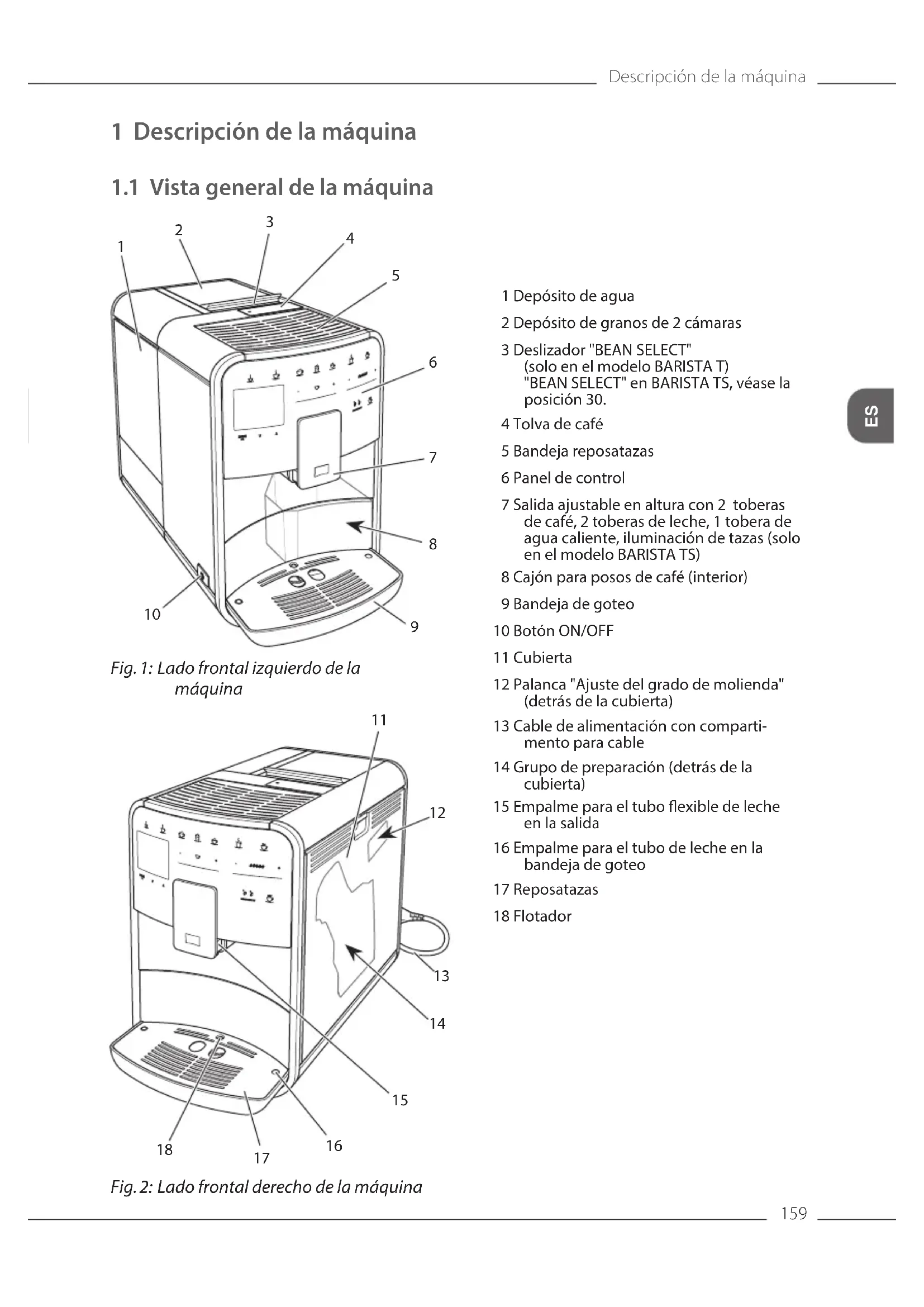Fig. 2: Lado frontal derecho de la máquina 1 Depósito de agua 2 Depósito de granos de 2 cámaras 3 Deslizador "BEAN SELECT" (solo en el modelo BARISTA T) "BEAN SELECT" en BARISTA TS, véase la posición 30. 4 Tolva de café 5 Bandeja reposatazas 6 Panel de control 7 Salida ajustable en altura con 2 toberas de café, 2 toberas de leche, 1 tobera de agua caliente, iluminación de tazas (solo en el modelo BARISTA TS) 8 Cajón para posos de café (interior) 9 Bandeja de goteo 10 Botón ON/OFF 11 Cubierta 12 Palanca "Ajuste del grado de molienda" (detrás de la cubierta) 13 Cable de alimentación con comparti- mento para cable 14 Grupo de preparación (detrás de la cubierta) 15 Empalme para el tubo exible de leche en la salida 16 Empalme para el tubo de leche en la bandeja de goteo 17 Reposatazas 18 FlotadorDescripción de la máquina