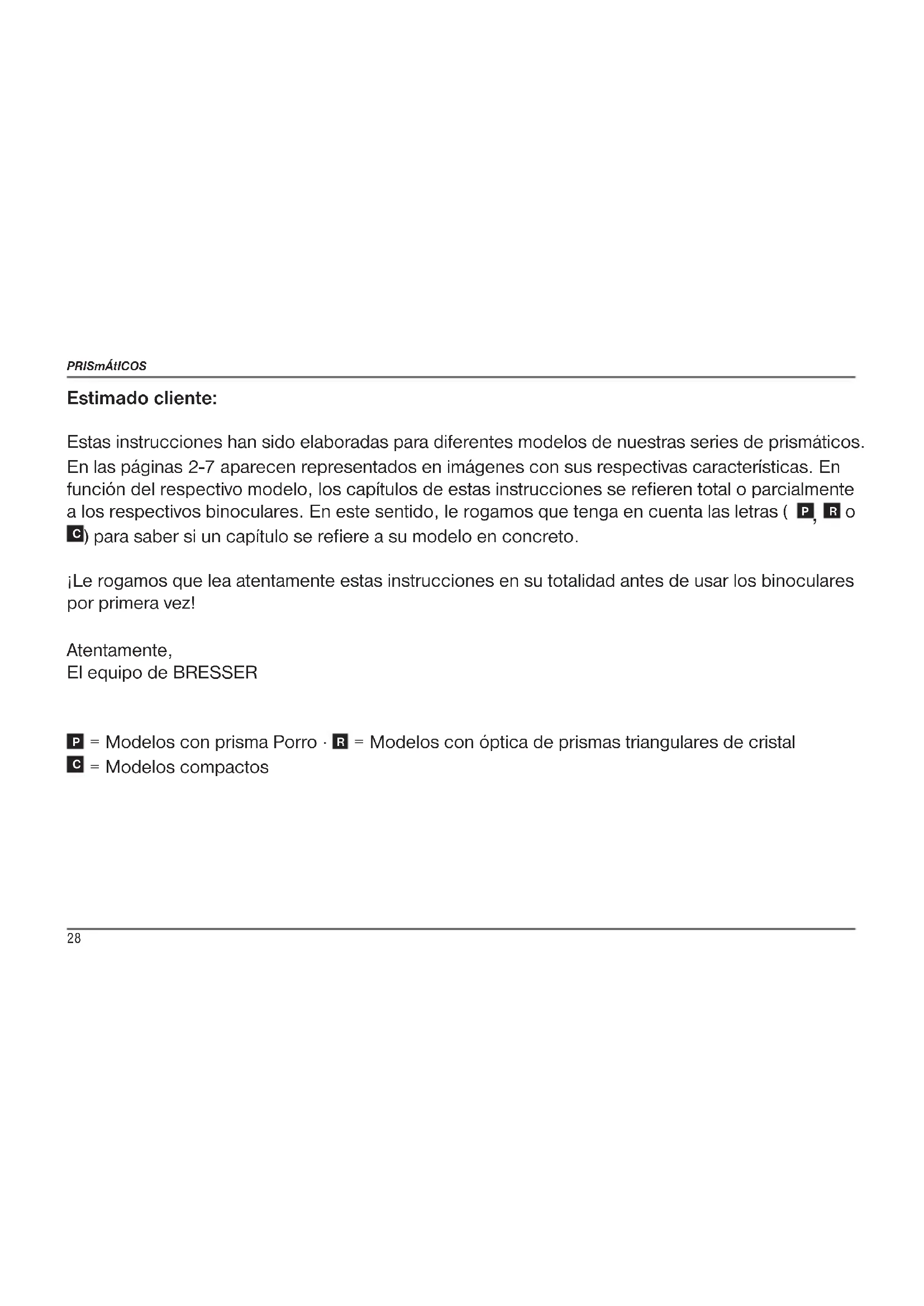 ) para saber si un capítulo se refiere a su modelo en concreto. ¡Le rogamos que lea atentamente estas instrucciones en su totalidad antes de usar los binoculares por primera vez! Atentamente, El equipo de BRESSER