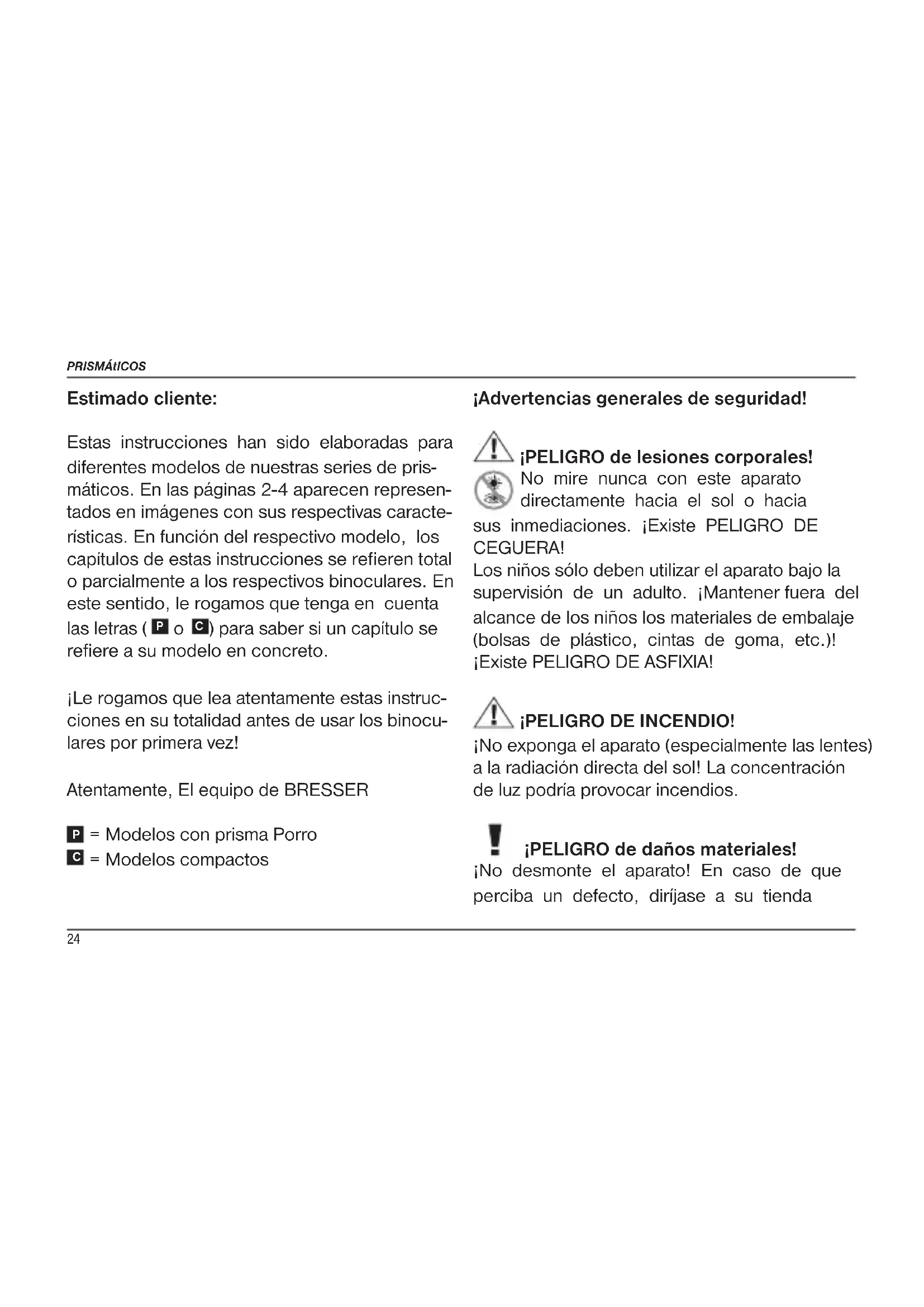 ) para saber si un capítulo se refiere a su modelo en concreto. ¡Le rogamos que lea atentamente estas instruc- ciones en su totalidad antes de usar los binocu- lares por primera vez! Atentamente, El equipo de BRESSER