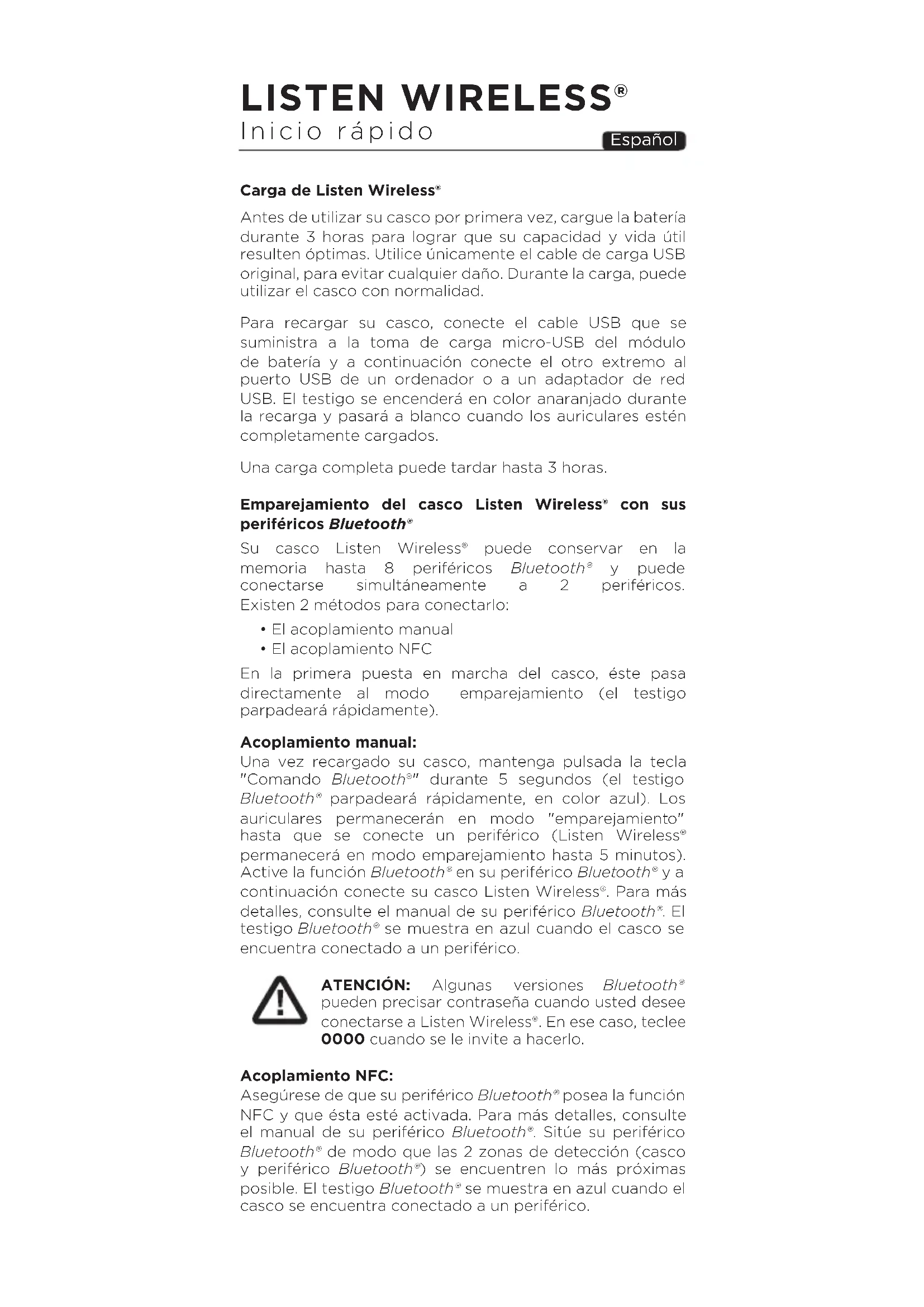 - El acoplamiento NFC En la primera puesta en marcha del casco, éste pasa directamente al modo emparejamiento (el testigo parpadeará rápidamente). Acoplamiento manual: Una vez recargado su casco, mantenga pulsada la tecla "Comando Bluetooth®" durante 5 segundos (el testigo Bluetooth® parpadeará rápidamente, en color azul). Los auriculares permanecerán en modo "emparejamiento" hasta que se conecte un periférico (Listen Wireless® permanecerá en modo emparejamiento hasta 5 minutos). Active la función Bluetooth® en su periférico Bluetooth® y a continuación conecte su casco Listen Wireless®. Para más detalles, consulte el manual de su periférico Bluetooth®. El testigo Bluetooth® se muestra en azul cuando el casco se encuentra conectado a un periférico. ATENCIÓN: Algunas versiones Bluetooth® pueden precisar contraseña cuando usted desee conectarse a Listen Wireless®. En ese caso, teclee 0000 cuando se le invite a hacerlo. Acoplamiento NFC: Asegúrese de que su periférico Bluetooth® posea la función NFC y que ésta esté activada. Para más detalles, consulte el manual de su periférico Bluetooth®. Sitúe su periférico Bluetooth® de modo que las 2 zonas de detección (casco y periférico Bluetooth®) se encuentren lo más próximas posible. El testigo Bluetooth® se muestra en azul cuando el casco se encuentra conectado a un periférico.25 LISTEN WIRELESS® Función Tecla Uso Encender el casco