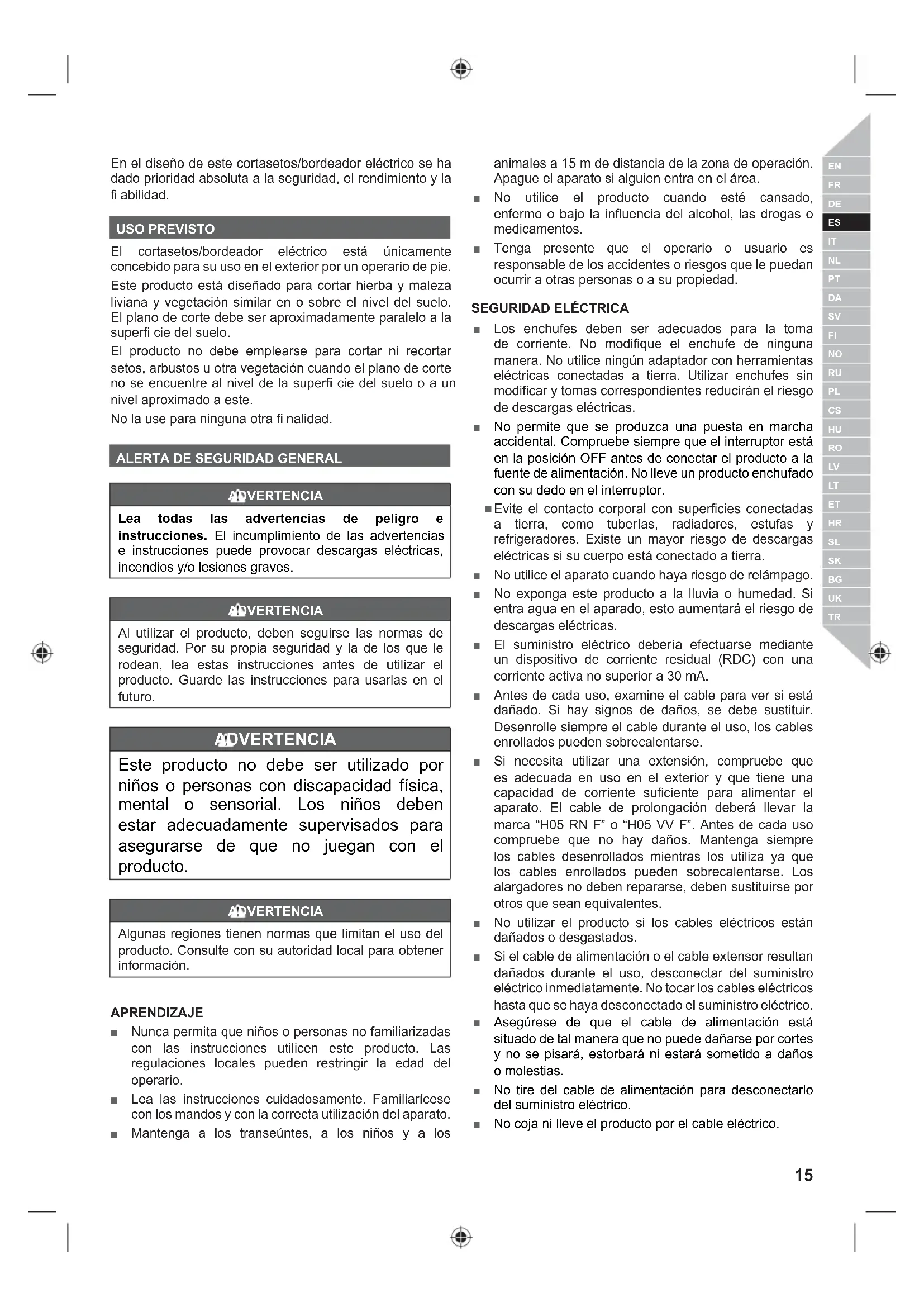 ADVERTENCIA Lea todas las advertencias de peligro e instrucciones. El incumplimiento de las advertencias e instrucciones puede provocar descargas eléctricas, incendios y/o lesiones graves. ADVERTENCIA Al utilizar el producto, deben seguirse las normas de seguridad. Por su propia seguridad y la de los que le rodean, lea estas instrucciones antes de utilizar el producto. Guarde las instrucciones para usarlas en el futuro. ADVERTENCIA Este producto no debe ser utilizado por niños o personas con discapacidad física, mental o sensorial. Los niños deben estar adecuadamente supervisados para asegurarse de que no juegan con el producto. ADVERTENCIA Algunas regiones tienen normas que limitan el uso del producto. Consulte con su autoridad local para obtener información. APRENDIZAJE ■ Nunca permita que niños o personas no familiarizadas con las instrucciones utilicen este producto. Las regulaciones locales pueden restringir la edad del operario. ■ Lea las instrucciones cuidadosamente. Familiarícese con los mandos y con la correcta utilización del aparato. ■ Mantenga a los transeúntes, a los niños y a los animales a 15 m de distancia de la zona de operación. Apague el aparato si alguien entra en el área. ■ No utilice el producto cuando esté cansado, enfermo o bajo la influencia del alcohol, las drogas o medicamentos. ■ Tenga presente que el operario o usuario es responsable de los accidentes o riesgos que le puedan ocurrir a otras personas o a su propiedad.