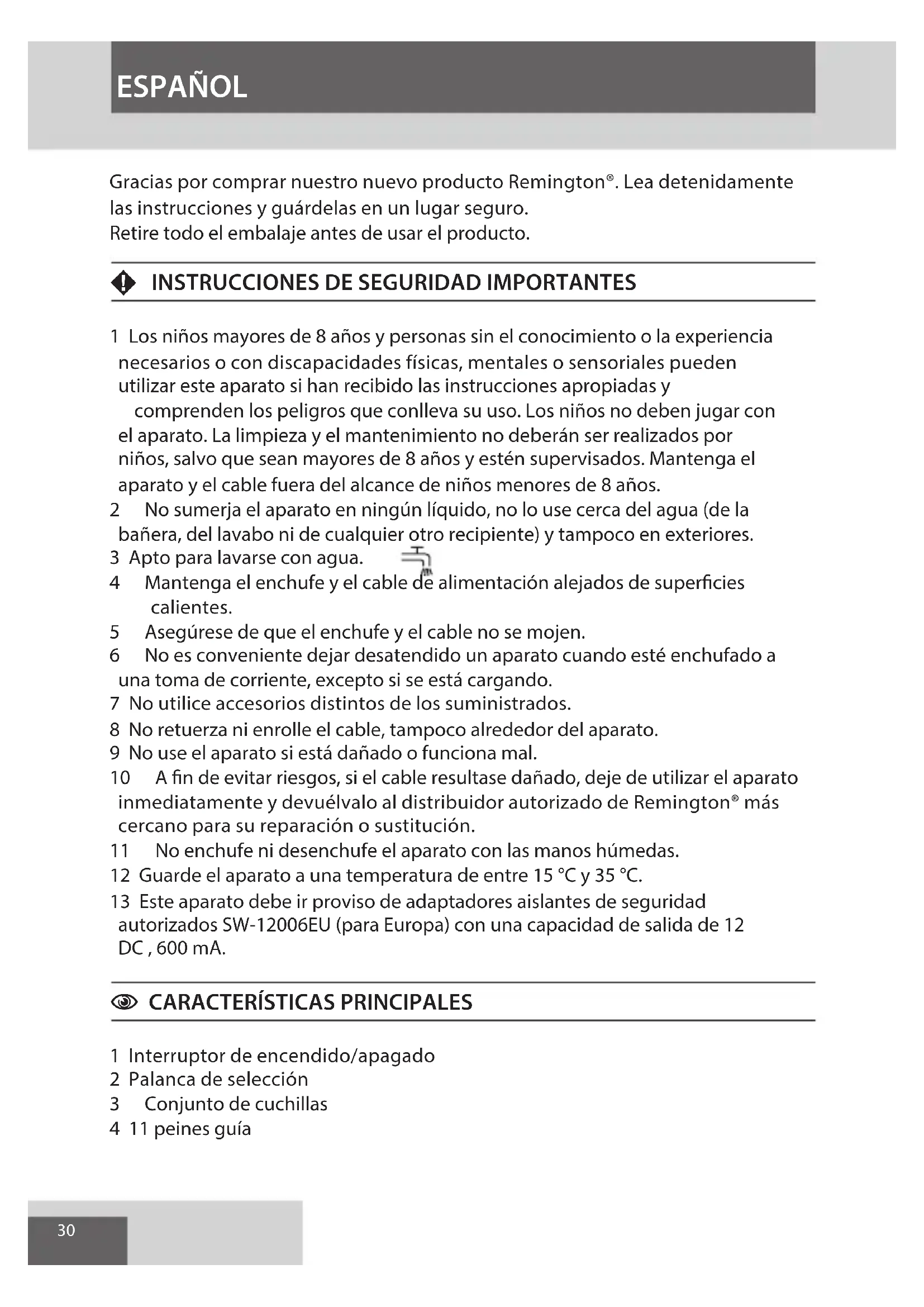 Gracias por comprar nuestro nuevo producto Remington®. Lea detenidamente las instrucciones y guárdelas en un lugar seguro.
