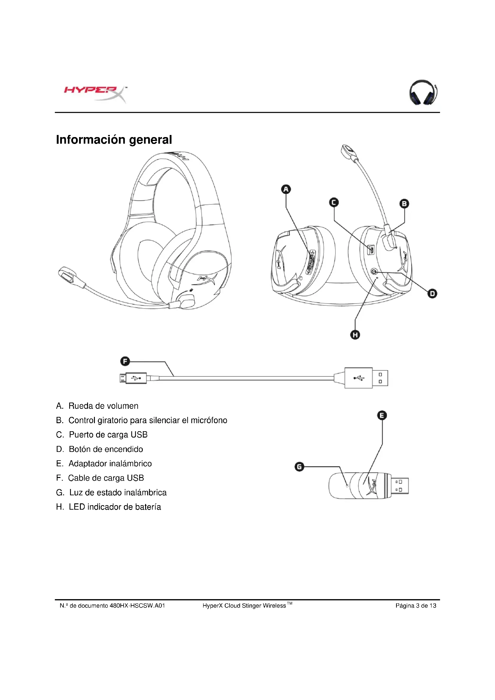 A. Rueda de volumen B. Control giratorio para silenciar el micrófono C. Puerto de carga USB D. Botón de encendido E. Adaptador inalámbrico F. Cable de carga USB G. Luz de estado inalámbrica H. LED indicador de bateríaN.º de documento 480HX-HSCSW.A01 HyperX Cloud Stinger Wireless