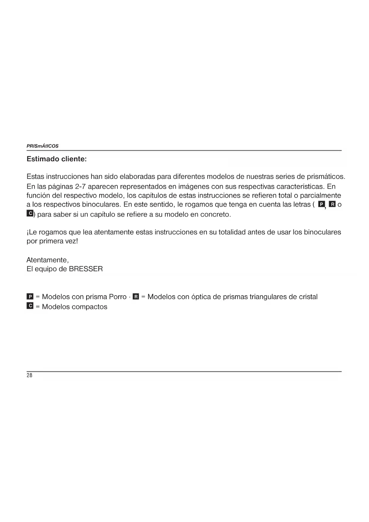 ) para saber si un capítulo se refiere a su modelo en concreto. ¡Le rogamos que lea atentamente estas instrucciones en su totalidad antes de usar los binoculares por primera vez! Atentamente, El equipo de BRESSER