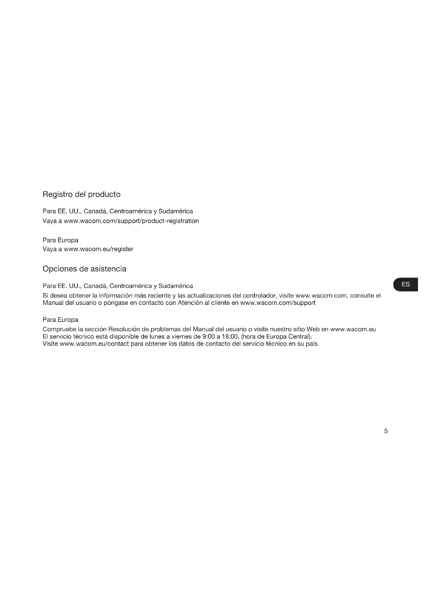 Registro del producto Para EE. UU., Canadá, Centroamérica y Sudamérica Vaya a www.wacom.com/support/product-registration Para Europa Vaya a www.wacom.eu/register Opciones de asistencia Para EE. UU., Canadá, Centroamérica y Sudamérica Si desea obtener la información más reciente y las actualizaciones del controlador, visite www.wacom.com, consulte el Manual del usuario o póngase en contacto con Atención al cliente en www.wacom.com/support Para Europa Compruebe la sección Resolución de problemas del Manual del usuario o visite nuestro sitio Web en www.wacom.eu El servicio técnico está disponible de lunes a viernes de 9:00 a 18:00, (hora de Europa Central). Visite www.wacom.eu/contact para obtener los datos de contacto del servicio técnico en su país.ES