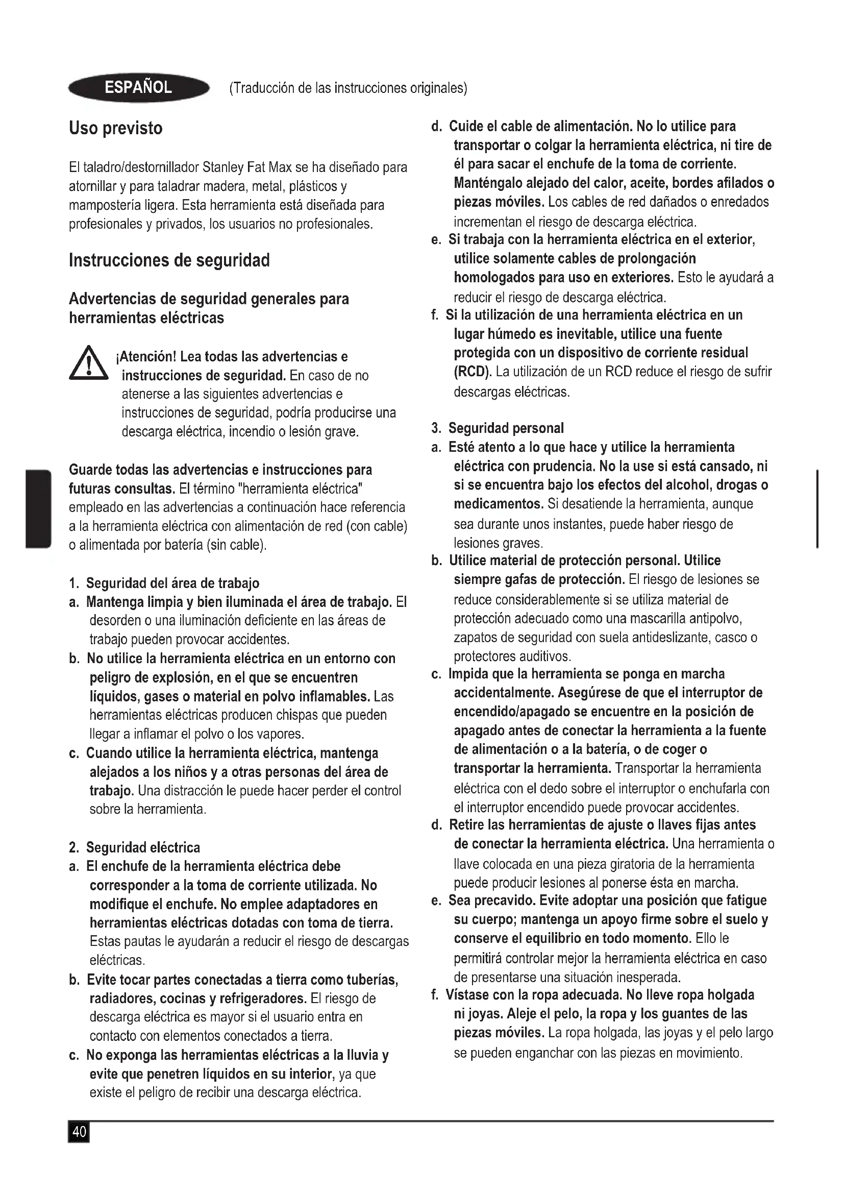 Kevin Hewitt Vicepresidente de Ingeniería global Stanley Europe, Egide Walschaertsstraat 14-18, 2800 Mechelen, Bélgica 20/03/201447 (Traducción de las instrucciones originales) ESPAÑOL Garantía Stanley Europe confía plenamente en la calidad de sus productos y ofrece una garantía extraordinaria destinada a usuarios profesionales del producto. Esta declaración de garantía es un añadido y en ningún caso un perjuicio a sus derechos legales como usuario no profesional privado. La garantía es válida dentro de los territorios de los Estados miembros de la Unión Europea y de los de la Zona Europea de Libre Comercio. UN AÑO DE GARANTÍA TOTAL Si un producto Stanley Fat Max resultara defectuoso debido a materiales o mano de obra defectuosos, Stanley Europe garantiza, dentro de los 12 meses de la fecha de compra, la sustitución de las piezas defectuosas sin cargo alguno o, según nuestro criterio, la sustitución de la unidad sin cargo alguno siempre que: u El producto no se ha sometido a un uso inadecuado o se ha utilizado de acuerdo con este manual de instrucciones. u El producto se ha sometido a un desgaste y rotura razonables. u Personal no autorizado no ha intentado reparar el producto. u Se aporta prueba de compra. u Se devuelve el producto Stanley Fat Max completo con todos los componentes originales. Si desea realizar una reclamación, póngase en contacto con su vendedor o consulte la dirección de su servicio técnico especializado autorizado de Stanley Fat Max más cercano que aparece en el catálogo de Stanley Fat Max o póngase en contacto con la ocina de Stanley en la dirección que se indica en este manual. Puede consultar la lista de servicios técnicos autorizados de Stanley Fat Max y obtener la información completa de nuestros servicios de posventa disponibles en la siguiente dirección de Internet:www.stanley. eu/348 (Tradução das instruções originais) PORTUGUÊS Utilização prevista O seu berbequim/aparafusadora Stanley Fat Max foi concebido para aparafusar e para perfurar madeira, metal, plástico e pedra macia. Esta ferramenta destina-se a prossionais e privadas, usuários não-prossionais. Instruções de segurança Avisos de segurança gerais para ferramentas eléctricas