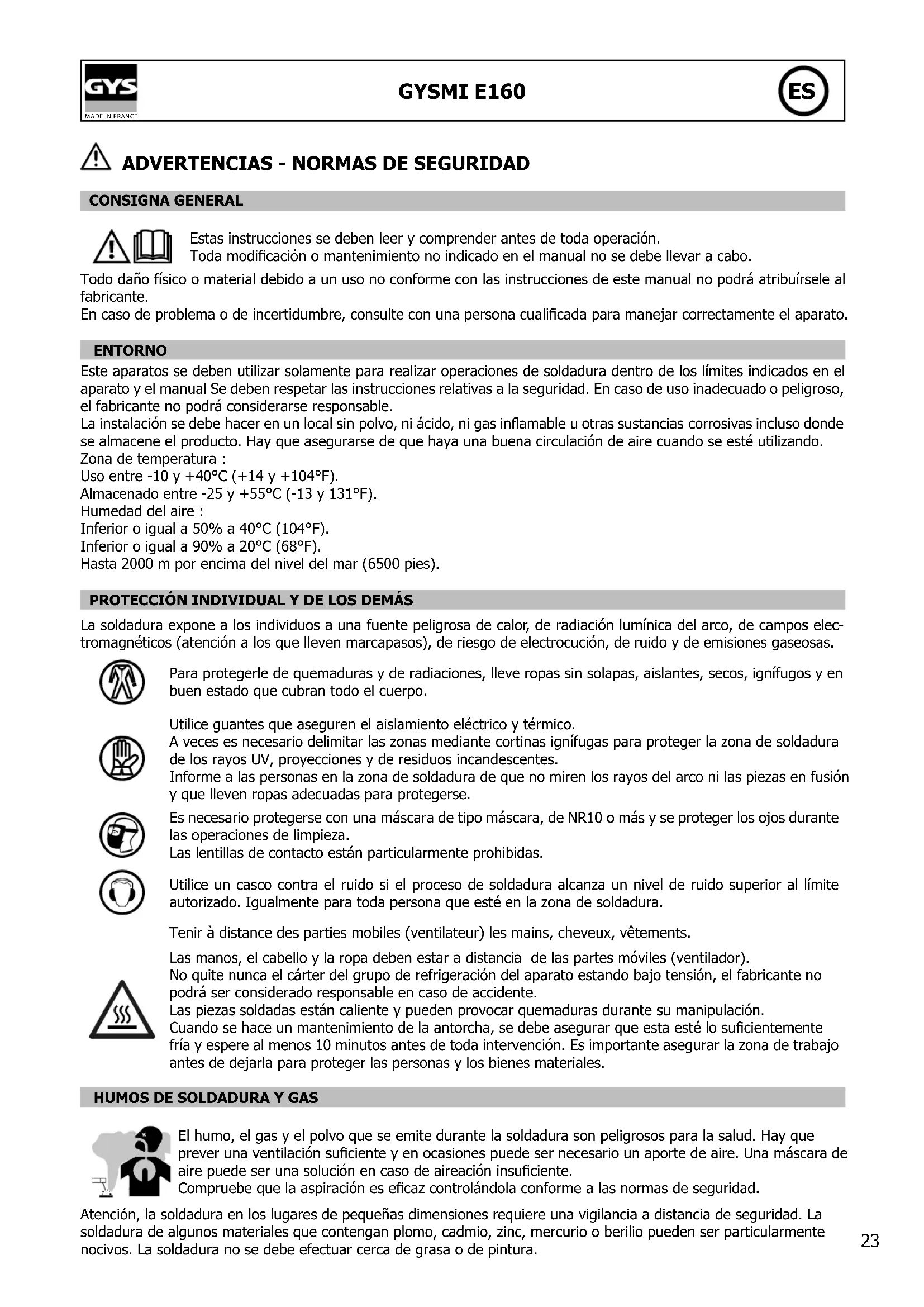 El humo, el gas y el polvo que se emite durante la soldadura son peligrosos para la salud. Hay que prever una ventilación suciente y en ocasiones puede ser necesario un aporte de aire. Una máscara de aire puede ser una solución en caso de aireación insuciente. Compruebe que la aspiración es ecaz controlándola conforme a las normas de seguridad. Atención, la soldadura en los lugares de pequeñas dimensiones requiere una vigilancia a distancia de seguridad. La soldadura de algunos materiales que contengan plomo, cadmio, zinc, mercurio o berilio pueden ser particularmente nocivos. La soldadura no se debe efectuar cerca de grasa o de pintura.24 GYSMI E160