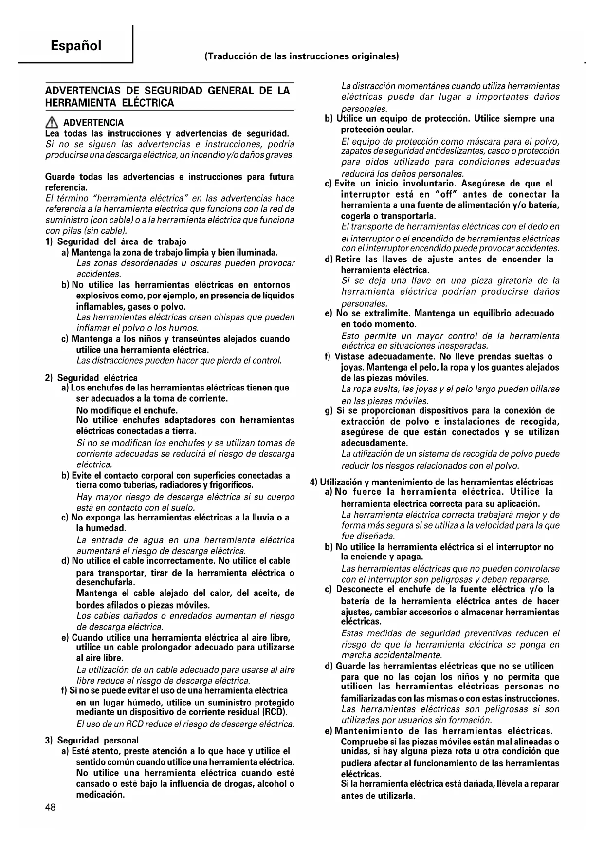ADVERTENCIA Lea todas las instrucciones y advertencias de seguridad. Si no se siguen las advertencias e instrucciones, podría producirse una descarga eléctrica, un incendio y/o daños graves. Guarde todas las advertencias e instrucciones para futura referencia. El término “herramienta eléctrica” en las advertencias hace referencia a la herramienta eléctrica que funciona con la red de suministro (con cable) o a la herramienta eléctrica que funciona con pilas (sin cable).