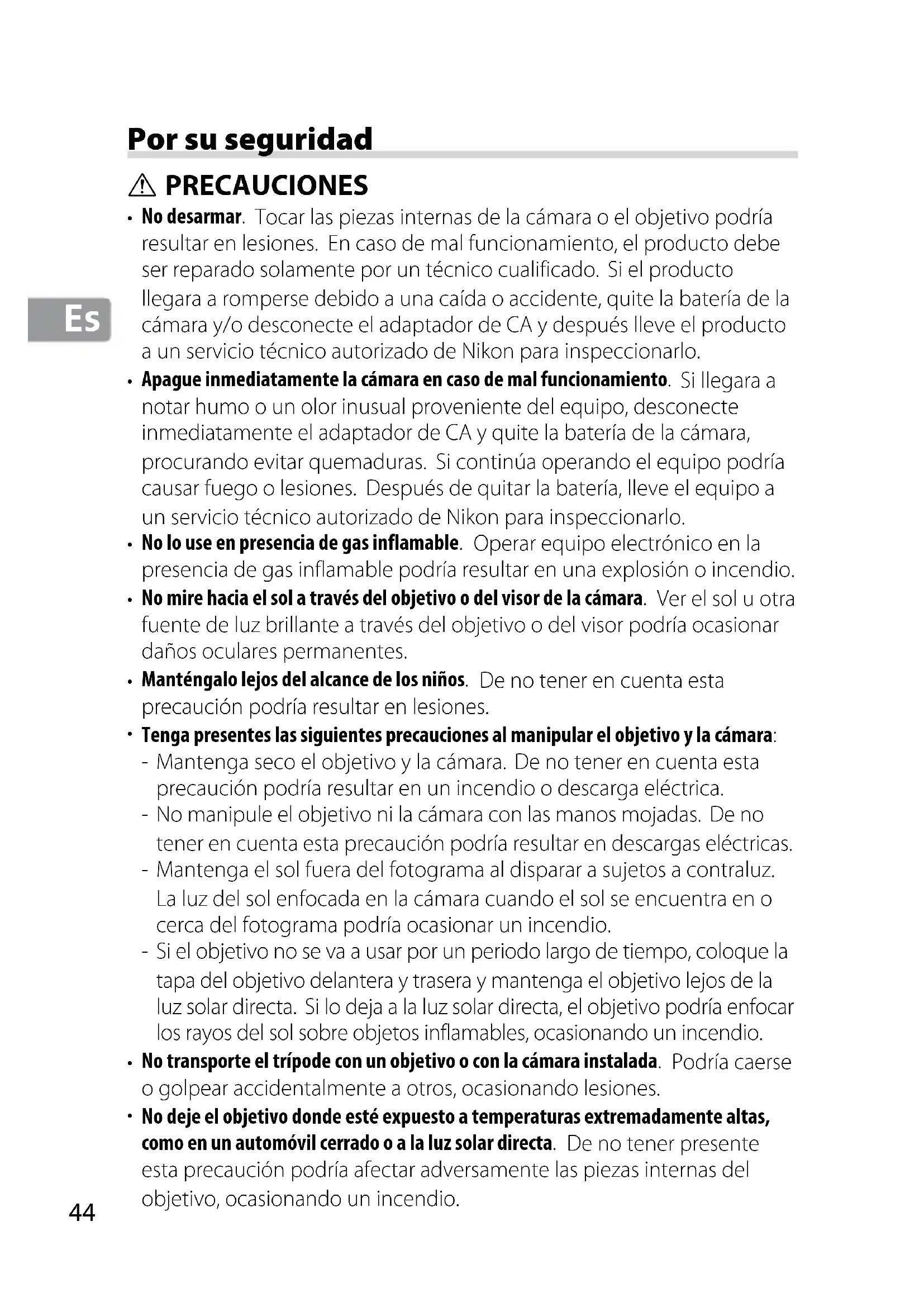 Por su seguridad PRECAUCIONES No desarmar. Tocar las piezas internas de la cámara o el objetivo podría resultar en lesiones. En caso de mal funcionamiento, el producto debe ser reparado solamente por un técnico cualificado. Si el producto llegara a romperse debido a una caída o accidente, quite la batería de la cámara y/o desconecte el adaptador de CA y después lleve el producto a un servicio técnico autorizado de Nikon para inspeccionarlo. Apague inmediatamente la cámara en caso de mal funcionamiento. Si llegara a notar humo o un olor inusual proveniente del equipo, desconecte inmediatamente el adaptador de CA y quite la batería de la cámara, procurando evitar quemaduras. Si continúa operando el equipo podría causar fuego o lesiones. Después de quitar la batería, lleve el equipo a un servicio técnico autorizado de Nikon para inspeccionarlo. No lo use en presencia de gas inflamable. Operar equipo electrónico en la presencia de gas inflamable podría resultar en una explosión o incendio. No mire hacia el sol a través del objetivo o del visor de la cámara. Ver el sol u otra fuente de luz brillante a través del objetivo o del visor podría ocasionar daños oculares permanentes. Manténgalo lejos del alcance de los niños. De no tener en cuenta esta precaución podría resultar en lesiones. Tenga presentes las siguientes precauciones al manipular el objetivo y la cámara: Mantenga seco el objetivo y la cámara. De no tener en cuenta esta precaución podría resultar en un incendio o descarga eléctrica. No manipule el objetivo ni la cámara con las manos mojadas. De no tener en cuenta esta precaución podría resultar en descargas eléctricas. Mantenga el sol fuera del fotograma al disparar a sujetos a contraluz. La luz del sol enfocada en la cámara cuando el sol se encuentra en o cerca del fotograma podría ocasionar un incendio. Si el objetivo no se va a usar por un periodo largo de tiempo, coloque la tapa del objetivo delantera y trasera y mantenga el objetivo lejos de la luz solar directa. Si lo deja a la luz solar directa, el objetivo podría enfocar los rayos del sol sobre objetos inflamables, ocasionando un incendio. No transporte el trípode con un objetivo o con la cámara instalada. Podría caerse o golpear accidentalmente a otros, ocasionando lesiones. No deje el objetivo donde esté expuesto a temperaturas extremadamente altas, como en un automóvil cerrado o a la luz solar directa. De no tener presente esta precaución podría afectar adversamente las piezas internas del objetivo, ocasionando un incendio.