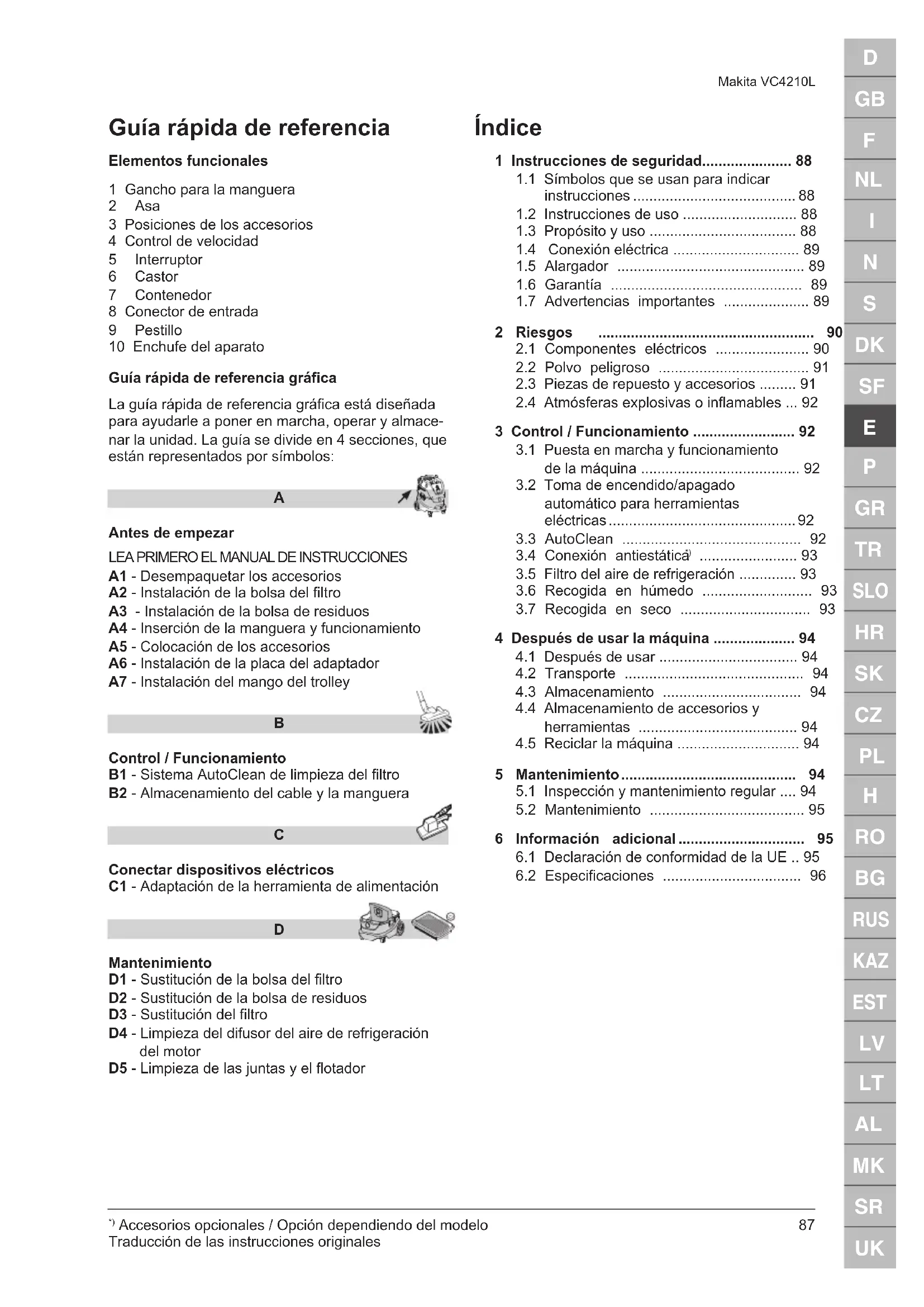 Mantenimiento D1 - Sustitución de la bolsa del filtro D2 - Sustitución de la bolsa de residuos D3 - Sustitución del filtro D4 - Limpieza del difusor del aire de refrigeración del motor D5 - Limpieza de las juntas y el flotador Índice 1 Instrucciones de seguridad...................... 88