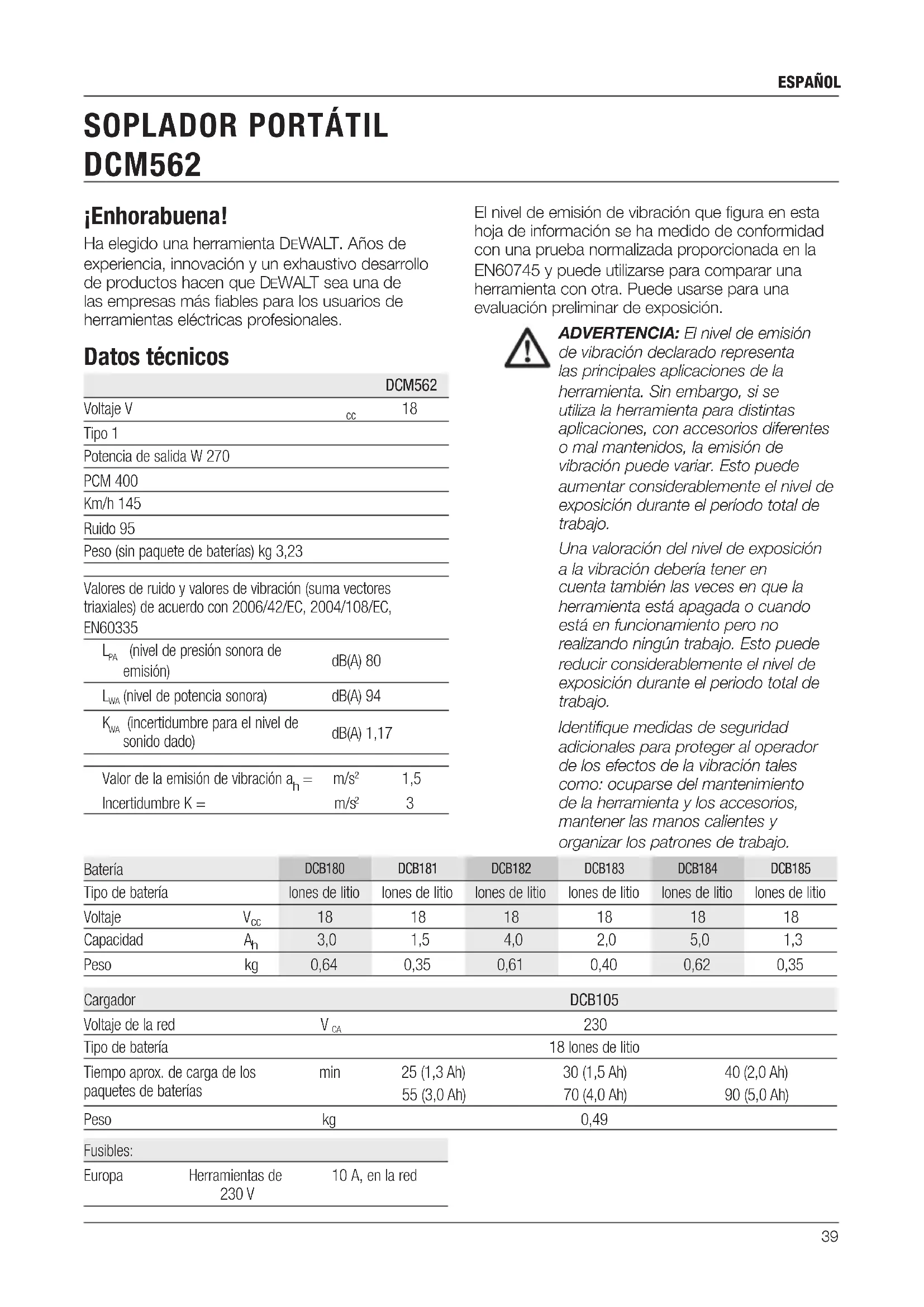 Tipo de batería 18 Iones de litio Tiempo aprox. de carga de los paquetes de baterías min 25 (1,3 Ah) 30 (1,5 Ah) 40 (2,0 Ah) 55 (3,0 Ah) 70 (4,0 Ah) 90 (5,0 Ah) Peso kg 0,49 Fusibles: Europa Herramientas de 230 V 10 A, en la red40 español El que suscribe es responsable de la compilación del archivo técnico y realiza esta declaración en representación de DeWALT. Markus Rompel Director de Ingeniería DeWALT, Richard-Klinger-Strase 11, D-65510, Idstein, Alemania