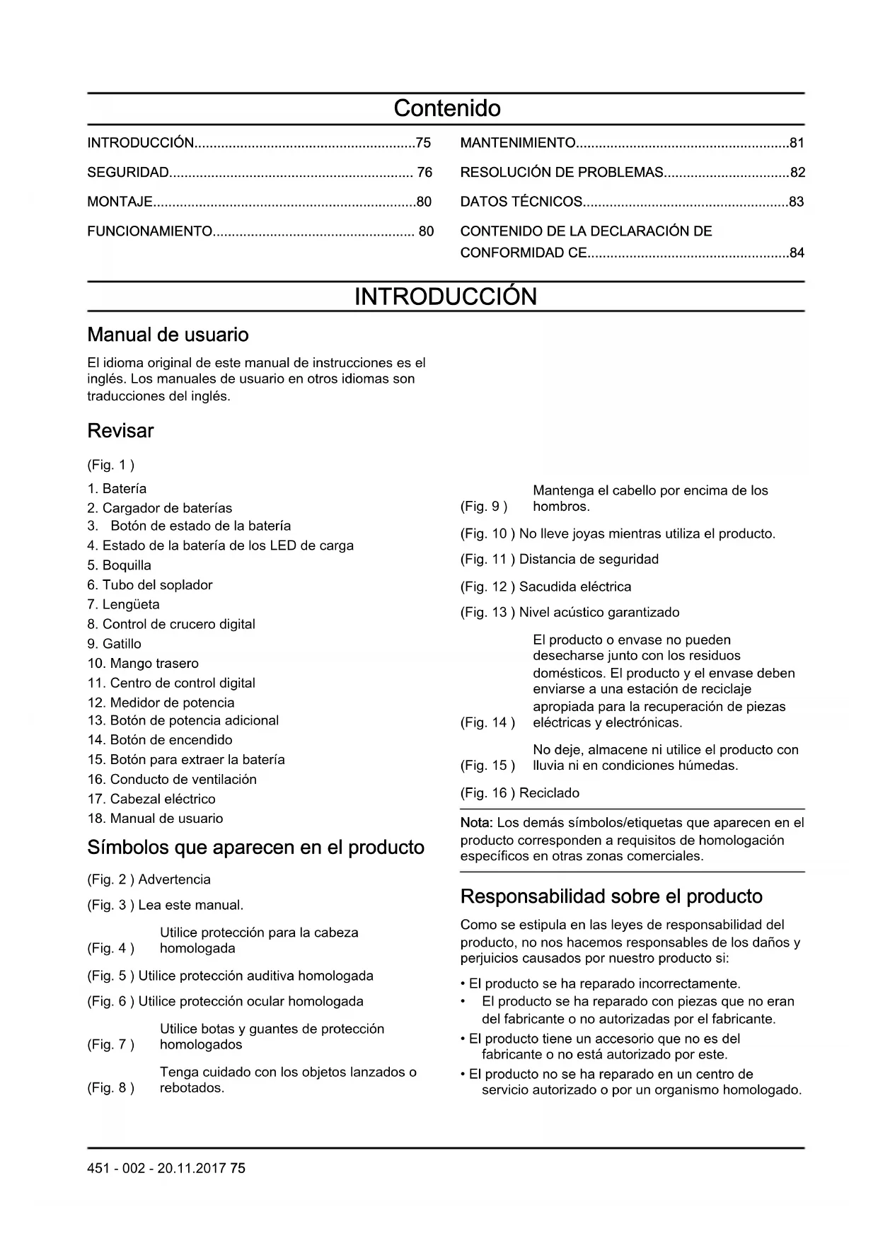 | Nivel de presión de sonido equivalente en el oído del operador medido según el ISO 22868 equipado con tubos de la sopladora (original) | dB(A) 84 | |