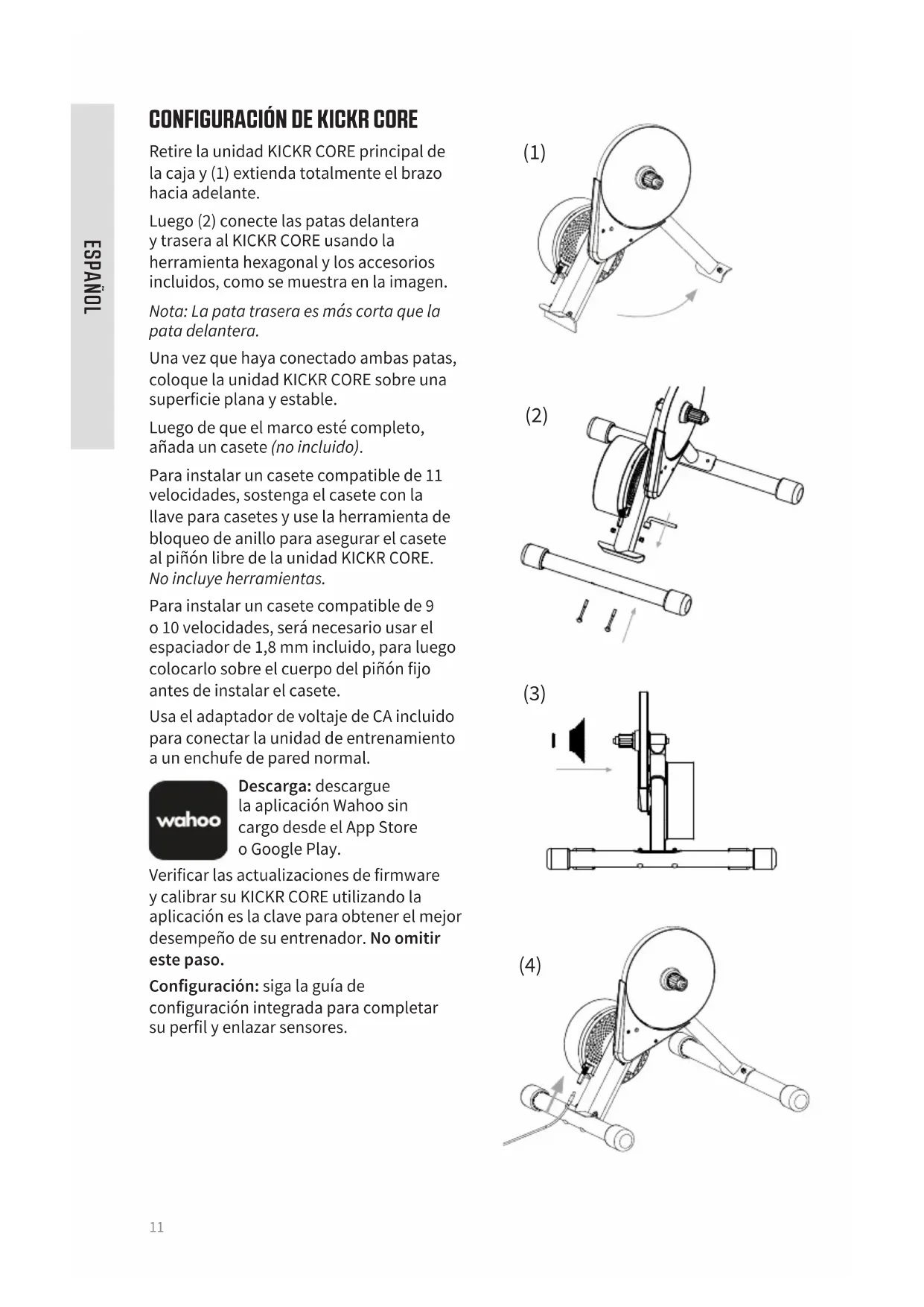 Retire la unidad KICKR CORE principal de la caja y (1) extienda totalmente el brazo hacia adelante. Luego (2) conecte las patas delantera y trasera al KICKR CORE usando la herramienta hexagonal y los accesorios incluidos, como se muestra en la imagen. Nota: La pata trasera es más corta que la pata delantera. Una vez que haya conectado ambas patas, coloque la unidad KICKR CORE sobre una superficie plana y estable. Luego de que el marco esté completo, añada un casete (no incluido). Para instalar un casete compatible de 11 velocidades, sostenga el casete con la llave para casetes y use la herramienta de bloqueo de anillo para asegurar el casete al piñón libre de la unidad KICKR CORE. No incluye herramientas. Para instalar un casete compatible de 9 o 10 velocidades, será necesario usar el espaciador de 1,8 mm incluido, para luego colocarlo sobre el cuerpo del piñón fijo antes de instalar el casete. Usa el adaptador de voltaje de CA incluido para conectar la unidad de entrenamiento a un enchufe de pared normal. Descarga: descargue la aplicación Wahoo sin cargo desde el App Store o Google Play. Verificar las actualizaciones de firmware y calibrar su KICKR CORE utilizando la aplicación es la clave para obtener el mejor desempeño de su entrenador. No omitir este paso. Configuración: siga la guía de configuración integrada para completar su perfil y enlazar sensores. ESPAÑOL (1) (2) (3) (4)12 IMPORTANTE: levante la rueda frontal mientras presiona el asiento para asegurarse de que la bicicleta se encuentre bien insertada en el entrenador.