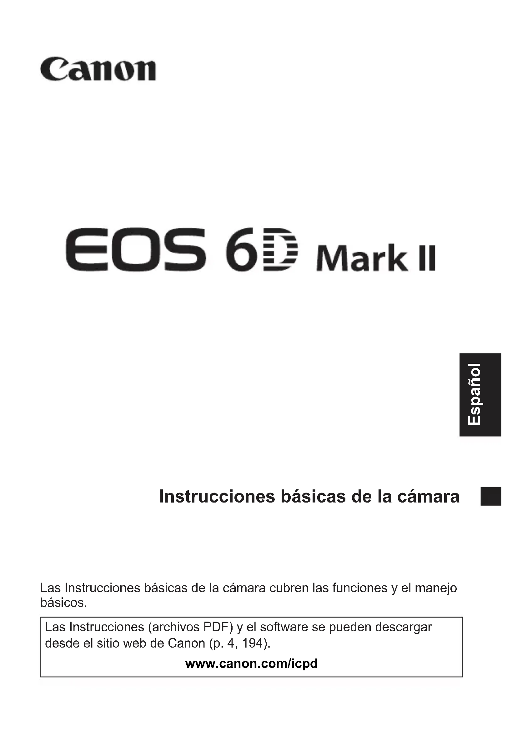 Visionnement des images.......... W-29Les descriptions dans ce mode d’emploi datent de mars 2017. Pour des informations sur la compatibilité avec des produits commercialisés après cette date, prenez contact avec un Service Après-Vente Canon. Pour le mode d’emploi le plus récent, consultez le site Web de Canon.Las Instrucciones básicas de la cámara cubren las funciones y el manejo básicos. Instrucciones básicas de la cámara Las Instrucciones (archivos PDF) y el software se pueden descargar desde el sitio web de Canon (p. 4, 194). Español www.canon.com/icpd2 La EOS 6D Mark II es una cámara SLR digital que incorpora un sensor CMOS de fotograma completo (aprox. 35,9 x 24,0 mm) con aprox. 26,2 megapíxeles efectivos, DIGIC 7, gama de sensibilidad ISO normal de ISO 100 - ISO 40000 (para fotos), AF de 45 puntos de alta precisión y alta velocidad (hasta 45 puntos de tipo en cruz), velocidad máxima de disparos en serie de aprox. 6,5 disparos/seg., disparo con Visión en Directo, grabación de vídeo Full HD, grabación de vídeo time-lapse 4K, AF CMOS Dual Pixel, función Wi-Fi/NFC/Bluetooth (comunicación inalámbrica) y función GPS. Antes de empezar a disparar, lea lo siguiente Para evitar accidentes y fotografías mediocres, primero lea las “Precauciones de seguridad” (p. 15-17) y las “Precauciones de manejo” (p. 18-20). Además, lea atentamente este manual para asegurarse de utilizar la cámara correctamente. Consulte este manual mientras utiliza la cámara para conocerla mejor Haga algunos disparos de prueba mientras lee este manual y observe los resultados. De este modo entenderá mejor cómo funciona la cámara. Además, guarde bien este manual para poder consultarlo de nuevo cuando sea necesario. Prueba de la cámara antes de usarla y responsabilidad Después de fotografiar, reproduzca y revise si las imágenes se grabaron correctamente. Si la cámara o la tarjeta de memoria fallan y las imágenes no se pueden grabar o descargar en un ordenador, Canon no se hará responsable de las pérdidas o de los inconvenientes causados. Derechos de autor Las leyes sobre los derechos de autor de su país pueden prohibir el uso de imágenes grabadas de algunos motivos o de personas fuera del uso privado. Asimismo, debe tener en cuenta que en algunas representaciones públicas, exposiciones, etc. se prohíbe tomar fotografías incluso para uso privado. Introducción3 Antes de empezar, compruebe si los siguientes elementos acompañan a la cámara. Si falta alguno, póngase en contacto con el distribuidor.