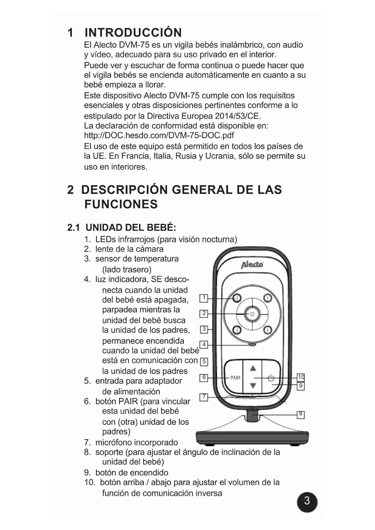7 ESPECIFICACIONES ................................................18 8 GARANT ...................................................................... 193 1 INTRODUCCIÓN El Alecto DVM-75 es un vigila bebés inalámbrico, con audio y vídeo, adecuado para su uso privado en el interior. Puede ver y escuchar de forma continua o puede hacer que el vigila bebés se encienda automáticamente en cuanto a su bebé empieza a llorar. Este dispositivo Alecto DVM-75 cumple con los requisitos esenciales y otras disposiciones pertinentes conforme a lo estipulado por la Directiva Europea 2014/53/CE. La declaración de conformidad está disponible en: http://DOC.hesdo.com/DVM-75-DOC.pdf El uso de este equipo está permitido en todos los países de la UE. En Francia, Italia, Rusia y Ucrania, sólo se permite su uso en interiores.