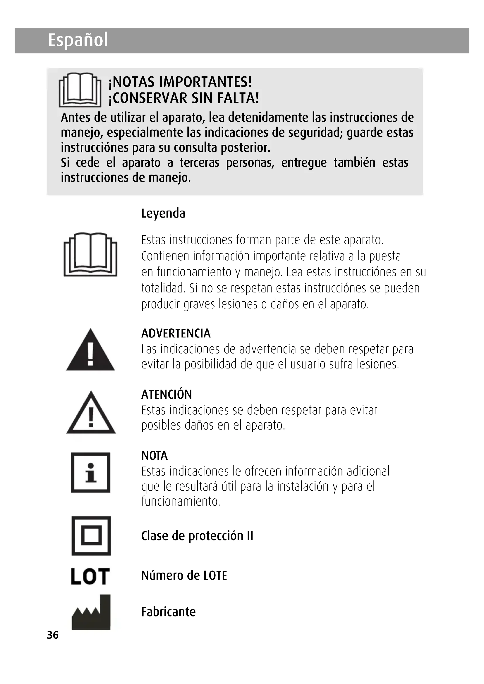 Leyenda Estas instrucciones forman parte de este aparato. Contienen información importante relativa a la puesta en funcionamiento y manejo. Lea estas instrucciónes en su totalidad. Si no se respetan estas instrucciónes se pueden producir graves lesiones o daños en el aparato. ADVERTENCIA Las indicaciones de advertencia se deben respetar para evitar la posibilidad de que el usuario sufra lesiones. ATENCIÓN Estas indicaciones se deben respetar para evitar posibles daños en el aparato. NOTA Estas indicaciones le ofrecen información adicional que le resultará útil para la instalación y para el funcionamiento. Clase de protección II Número de LOTE Fabricante 88830_PR-H90_DE-GB_NL_FR_ES_GR_IT_01072016_Kompakt-GA 01.07.16 17:13 Seite 3637 Español 1 Indicaciones de seguridad! fuente de alimentación