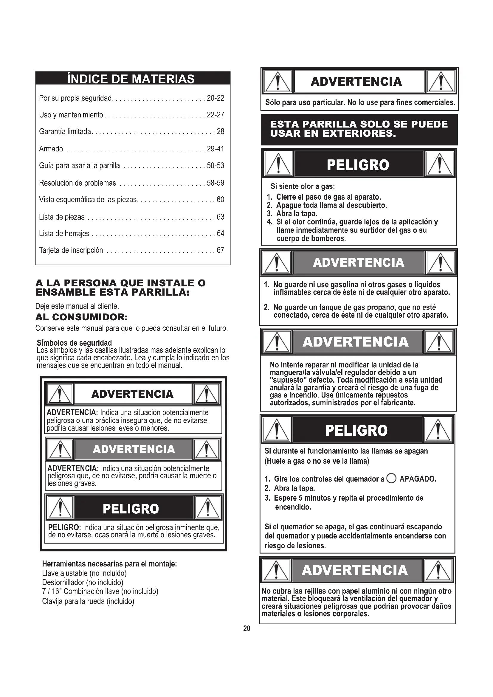 Antes de empezar a ensambar la parrilla y cocinar, lea y siga todas lasindicaciones de seguridad,las instrueriones de ensamblado y las instructriones de uso y de cuidado