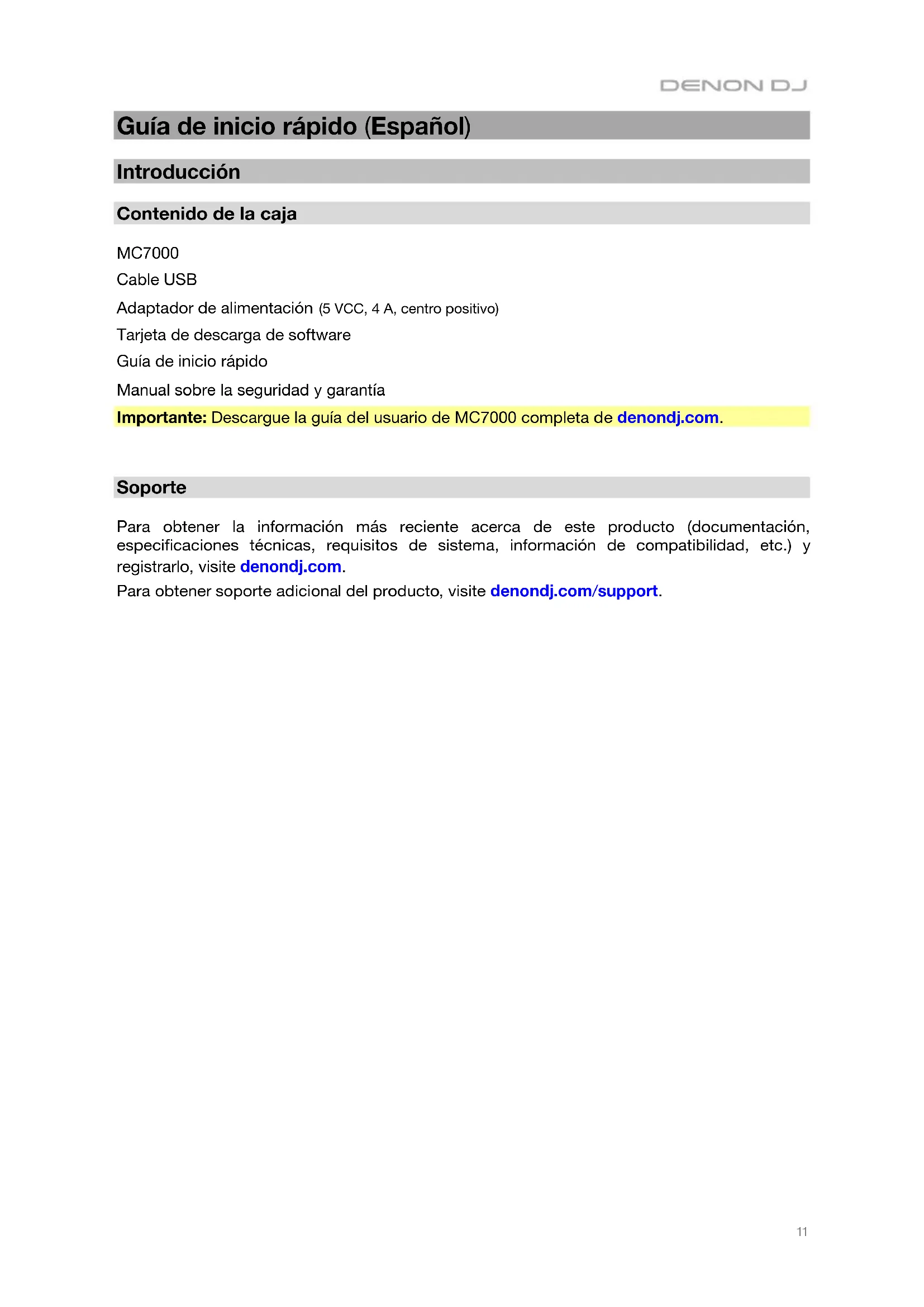 Guía de inicio rápido (Español) Introducción Contenido de la caja MC7000 Cable USB Adaptador de alimentación (5 VCC, 4 A, centro positivo) Tarjeta de descarga de software Guía de inicio rápido Manual sobre la seguridad y garantía Importante: Descargue la guía del usuario de MC7000 completa de denondj.com.