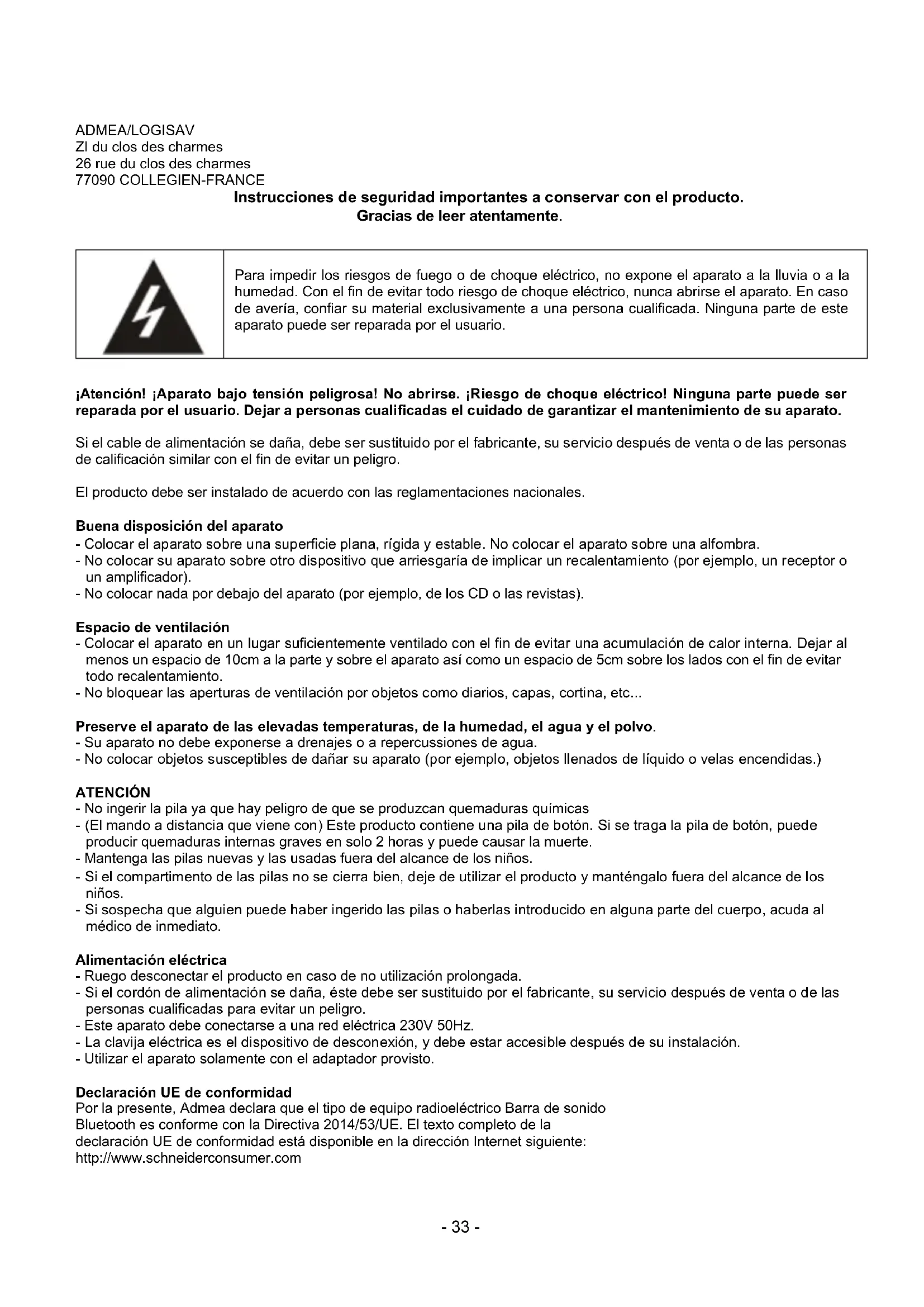 ¡Atención! ¡Aparato bajo tensión peligrosa! No abrirse. ¡Riesgo de choque eléctrico! Ninguna parte puede ser reparada por el usuario. Dejar a personas cualificadas el cuidado de garantizar el mantenimiento de su aparato. Si el cable de alimentación se daña, debe ser sustituido por el fabricante, su servicio después de venta o de las personas de calificación similar con el fin de evitar un peligro. El producto debe ser instalado de acuerdo con las reglamentaciones nacionales. Buena disposición del aparato - Colocar el aparato sobre una superficie plana, rígida y estable. No colocar el aparato sobre una alfombra. - No colocar su aparato sobre otro dispositivo que arriesgaría de implicar un recalentamiento (por ejemplo, un receptor o un amplificador). - No colocar nada por debajo del aparato (por ejemplo, de los CD o las revistas). Espacio de ventilación - Colocar el aparato en un lugar suficientemente ventilado con el fin de evitar una acumulación de calor interna. Dejar al menos un espacio de 10cm a la parte y sobre el aparato así como un espacio de 5cm sobre los lados con el fin de evitar todo recalentamiento. - No bloquear las aperturas de ventilación por objetos como diarios, capas, cortina, etc... Preserve el aparato de las elevadas temperaturas, de la humedad, el agua y el polvo. - Su aparato no debe exponerse a drenajes o a repercussiones de agua. - No colocar objetos susceptibles de dañar su aparato (por ejemplo, objetos llenados de líquido o velas encendidas.) ATENCIÓN - No ingerir la pila ya que hay peligro de que se produzcan quemaduras químicas - (El mando a distancia que viene con) Este producto contiene una pila de botón. Si se traga la pila de botón, puede producir quemaduras internas graves en solo 2 horas y puede causar la muerte. - Mantenga las pilas nuevas y las usadas fuera del alcance de los niños. - Si el compartimento de las pilas no se cierra bien, deje de utilizar el producto y manténgalo fuera del alcance de los niños. - Si sospecha que alguien puede haber ingerido las pilas o haberlas introducido en alguna parte del cuerpo, acuda al médico de inmediato. Alimentación eléctrica - Ruego desconectar el producto en caso de no utilización prolongada. - Si el cordón de alimentación se daña, éste debe ser sustituido por el fabricante, su servicio después de venta o de las personas cualificadas para evitar un peligro. - Este aparato debe conectarse a una red eléctrica 230V 50Hz. - La clavija eléctrica es el dispositivo de desconexión, y debe estar accesible después de su instalación. - Utilizar el aparato solamente con el adaptador provisto. Declaración UE de conformidad Por la presente, Admea declara que el tipo de equipo radioeléctrico Barra de sonido Bluetooth es conforme con la Directiva 2014/53/UE. El texto completo de la declaración UE de conformidad está disponible en la dirección Internet siguiente: http://www.schneiderconsumer.com- 34 -