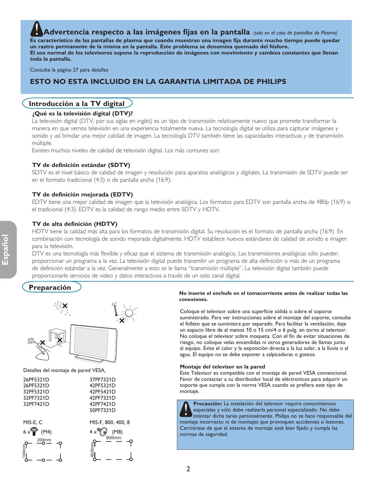 Reciclaje Los materiales que se usan en su aparato no son reutilizables ni se pueden reciclar. Para minimizar los desechos al medio ambiente, empresas especializadas recogen los aparatos usados y los desarman después para recuperar todo el material que se pueda reutilizar (consulte a su distribuidor para obtener mayores detalles). Español Contenido Advertencia respecto a las imágenes fijas en la pantalla (solo en el caso de pantallas de Plasma) Es característico de las pantallas de plasma que cuando muestran una imagen fija durante mucho tiempo puede quedar un rastro permanente de la misma en la pantalla. Este problema se denomina quemado del fósforo. El uso normal de los televisores supone la reproducción de imágenes con movimiento y cambios constantes que llenan toda la pantalla. Consulte la página 27 para detalles ESTO NO ESTA INCLUIDO EN LA GARANTIA LIMITADA DE PHILIPS Introducción a la TV digital ¿Qué es la televisión digital (DTV)? La televisión digital (DTV, por sus siglas en inglés) es un tipo de transmisión relativamente nuevo que promete transformar la manera en que vemos televisión en una experiencia totalmente nueva. La tecnología digital se utiliza para capturar imágenes y sonido y así brindar una mejor calidad de imagen. La tecnología DTV también tiene las capacidades interactivas y de transmisión múltiple. Existen muchos niveles de calidad de televisión digital. Los más comunes son: TV de definición estándar (SDTV) SDTV es el nivel básico de calidad de imagen y resolución para aparatos analógicos y digitales. La transmisión de SDTV puede ser en el formato tradicional (4:3) o de pantalla ancha (16:9). TV de definición mejorada (EDTV) EDTV tiene una mejor calidad de imagen que la televisión analógica. Los formatos para EDTV son pantalla ancha de 480p (16:9) o el tradicional (4:3). EDTV es la calidad de rango medio entre SDTV y HDTV. Español TV de alta definición (HDTV) HDTV tiene la calidad más alta para los formatos de transmisión digital. Su resolución es el formato de pantalla ancha (16:9). En combinación con tecnología de sonido mejorada digitalmente, HDTV establece nuevos estándares de calidad de sonido e imagen para la televisión. DTV es una tecnología más flexible y eficaz que el sistema de transmisión analógico. Las transmisiones analógicas sólo pueden proporcionar un programa a la vez. La televisión digital puede transmitir un programa de alta definición o más de un programa de definición estándar a la vez. Generalmente a esto se le llama “transmisión múltiple”. La televisión digital también puede proporcionarle servicios de video y datos interactivos a través de un solo canal digital. Preparación No inserte el enchufe en el tomacorriente antes de realizar todas las conexiones. Coloque el televisor sobre una superficie sólida o sobre el soporte suministrado. Para ver instrucciones sobre el montaje del soporte, consulte el folleto que se suministra por separado. Para facilitar la ventilación, deje un espacio libre de al menos 10 o 15 cm/4 o 6 pulg. en torno al televisor. No coloque el televisor sobre moqueta. Con el fin de evitar situaciones de riesgo, no coloque velas encendidas ni otros generadores de llamas junto al equipo. Evite el calor y la exposición directa a la luz solar, a la lluvia o al agua. El equipo no se debe exponer a salpicaduras o goteos. Detalles del montaje de pared VESA, 26PF5321D 37PF7321D 26PF5321D 42PF5321D file : pdp top safety_items.eps 32PF5321D 42PF5421D 32PF7321D 42PF7321D 32PF7421D 42PF7421D 50PF7321D Precaución: La instalación del televisor require conocimientos especiales y sólo debe realizarla personal especializado. No debe intentar dicha tarea personalmente. Philips no se hace responsable del montaje incorrecto ni de montajes que provoquen accidentes o lesiones. Cerciórese de que el sistema de montaje esté bien fijado y cumpla las normas de seguridad. 400mm 6 x (M4) Montaje del televisor en la pared Este Televisor es compatible con el montaje de pared VESA convencional. Favor de contactar a su distribuidor local de eléctronicos para adquirir un soporte que cumpla con la norma VESA cuando se prefiera este tipo de montaje.