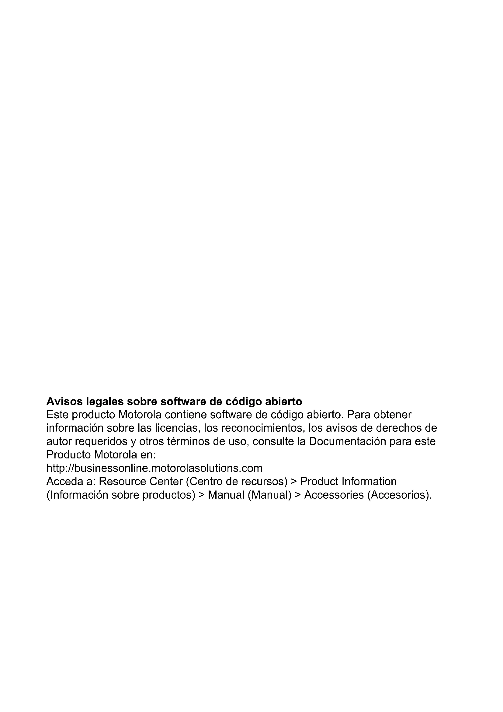 Los productos de Motorola descritos en el presente manual pueden incluir programas informáticos de Motorola protegidos por derechos de copyright almacenados en memorias de semiconductores o en otro tipo de medios. Las leyes de los Estados Unidos y de otros países preservan ciertos derechos exclusivos de Motorola con respecto a los programas informáticos protegidos por derechos de autor, que incluyen, entre otros, el derecho exclusivo de copia o reproducción en cualquier formato de un programa informático protegido por derechos de autor. Por consiguiente, se prohíbe la copia, la reproducción, la modificación, el uso de técnicas de ingeniería inversa y la distribución de forma alguna de todo programa informático de Motorola protegido por derechos de copyright e incluido en los productos descritos en el presente manual, sin el consentimiento expreso por escrito de Motorola. Asimismo, la adquisición de los productos de Motorola no garantiza, de forma implícita ni explícita, por impedimento legal ni de ningún otro modo, ningún tipo de licencia en lo que respecta a los derechos de copyright, las patentes o las solicitudes de patentes de Motorola, excepto en los casos de uso de licencias normales y no excluyentes derivados de la ejecución de la ley en la venta de un producto.Español