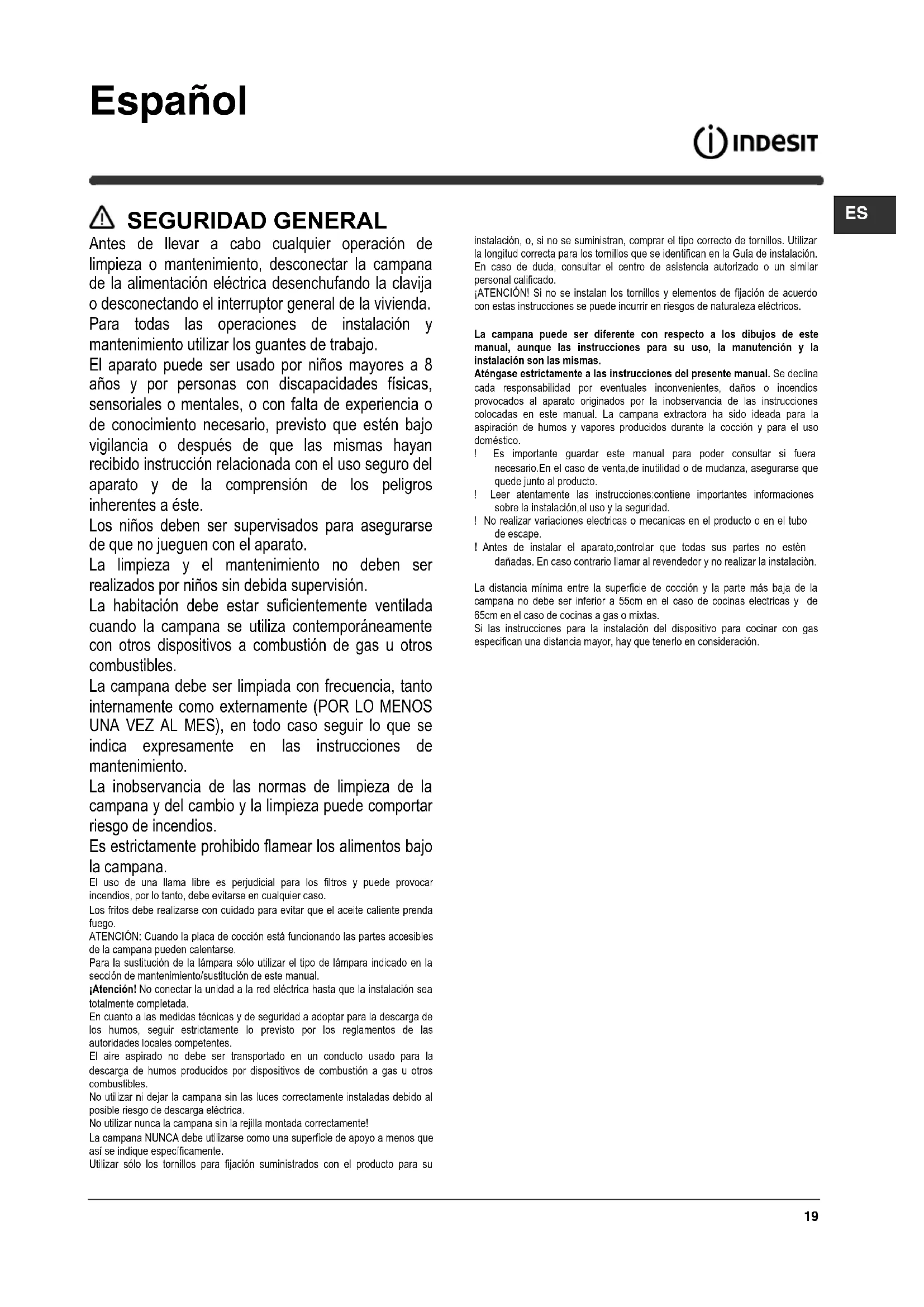 SEGURIDAD GENERAL Antes de llevar a cabo cualquier operación de limpieza o mantenimiento, desconectar la campana de la alimentación eléctrica desenchufando la clavija o desconectando el interruptor general de la vivienda. Para todas las operaciones de instalación y mantenimiento utilizar los guantes de trabajo. El aparato puede ser usado por niños mayores a 8 años y por personas con discapacidades físicas, sensoriales o mentales, o con falta de experiencia o de conocimiento necesario, previsto que estén bajo vigilancia o después de que las mismas hayan recibido instrucción relacionada con el uso seguro del aparato y de la comprensión de los peligros inherentes a éste. Los niños deben ser supervisados para asegurarse de que no jueguen con el aparato. La limpieza y el mantenimiento no deben ser realizados por niños sin debida supervisión. La habitación debe estar suficientemente ventilada cuando la campana se utiliza contemporáneamente con otros dispositivos a combustión de gas u otros combustibles. La campana debe ser limpiada con frecuencia, tanto internamente como externamente (POR LO MENOS UNA VEZ AL MES), en todo caso seguir lo que se indica expresamente en las instrucciones de mantenimiento. La inobservancia de las normas de limpieza de la campana y del cambio y la limpieza puede comportar riesgo de incendios. Es estrictamente prohibido flamear los alimentos bajo la campana. El uso de una llama libre es perjudicial para los filtros y puede provocar incendios, por lo tanto, debe evitarse en cualquier caso. Los fritos debe realizarse con cuidado para evitar que el aceite caliente prenda fuego. ATENCIÓN: Cuando la placa de cocción está funcionando las partes accesibles de la campana pueden calentarse. Para la sustitución de la lámpara sólo utilizar el tipo de lámpara indicado en la sección de mantenimiento/sustitución de este manual. ¡Atención! No conectar la unidad a la red eléctrica hasta que la instalación sea totalmente completada. En cuanto a las medidas técnicas y de seguridad a adoptar para la descarga de los humos, seguir estrictamente lo previsto por los reglamentos de las autoridades locales competentes. El aire aspirado no debe ser transportado en un conducto usado para la descarga de humos producidos por dispositivos de combustión a gas u otros combustibles. No utilizar ni dejar la campana sin las luces correctamente instaladas debido al posible riesgo de descarga eléctrica. No utilizar nunca la campana sin la rejilla montada correctamente! La campana NUNCA debe utilizarse como una superficie de apoyo a menos que así se indique específicamente. Utilizar sólo los tornillos para fijación suministrados con el producto para su instalación, o, si no se suministran, comprar el tipo correcto de tornillos. Utilizar la longitud correcta para los tornillos que se identifican en la Guía de instalación. En caso de duda, consultar el centro de asistencia autorizado o un similar personal calificado. ¡ATENCIÓN! Si no se instalan los tornillos y elementos de fijación de acuerdo con estas instrucciones se puede incurrir en riesgos de naturaleza eléctricos. La campana puede ser diferente con respecto a los dibujos de este manual, aunque las instrucciones para su uso, la manutención y la instalación son las mismas. Aténgase estrictamente a las instrucciones del presente manual. Se declina cada responsabilidad por eventuales inconvenientes, daños o incendios provocados al aparato originados por la inobservancia de las instrucciones colocadas en este manual. La campana extractora ha sido ideada para la aspiración de humos y vapores producidos durante la cocción y para el uso doméstico. ! Es importante guardar este manual para poder consultar si fuera necesario.En el caso de venta,de inutilidad o de mudanza, asegurarse que quede junto al producto. ! Leer atentamente las instrucciones:contiene importantes informaciones sobre la instalación,el uso y la seguridad. ! No realizar variaciones electricas o mecanicas en el producto o en el tubo de escape. ! Antes de instalar el aparato,controlar que todas sus partes no estèn dañadas. En caso contrario llamar al revendedor y no realizar la instalaciòn. La distancia mínima entre la superficie de cocción y la parte más baja de la campana no debe ser inferior a 55cm en el caso de cocinas electricas y de 65cm en el caso de cocinas a gas o mixtas. Si las instrucciones para la instalación del dispositivo para cocinar con gas especifican una distancia mayor, hay que tenerlo en consideración.20