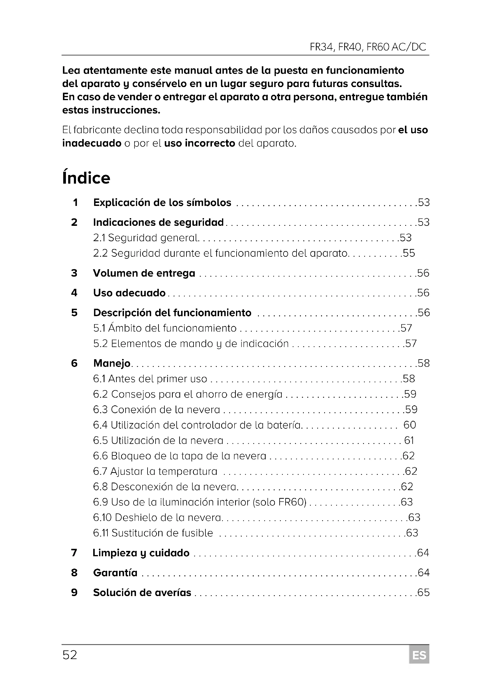 ¡AVISO! Compare el valor de tensión indicado en la placa de características con el suministro de energía existente. Conecte el aparato únicamente del siguiente modo: – conecte el cable de alimentación CC a una caja de enchufe CC en el vehículo – o bien conecte el cable de alimentación de CA a la red de corriente alterna No extraiga nunca la clavija de la caja de enchufe tirando del cable de conexión. Si la nevera está conectada a la caja de enchufe CC: Desconecte de la batería el aparato refrigerador u otros dispositivos consumidores si va a conectar un cargador rápido. Si la nevera está conectada a la caja de enchufe CC: Desconecte la conexión o apague el aparato cuando apague el motor. De lo contrario podrá descargarse la batería. FR34-FR40-FR60--O-16s.book Seite 54 Donnerstag, 19. Juli 2018 3:22 15ES FR34, FR40, FR60 AC/DC Indicaciones de seguridad