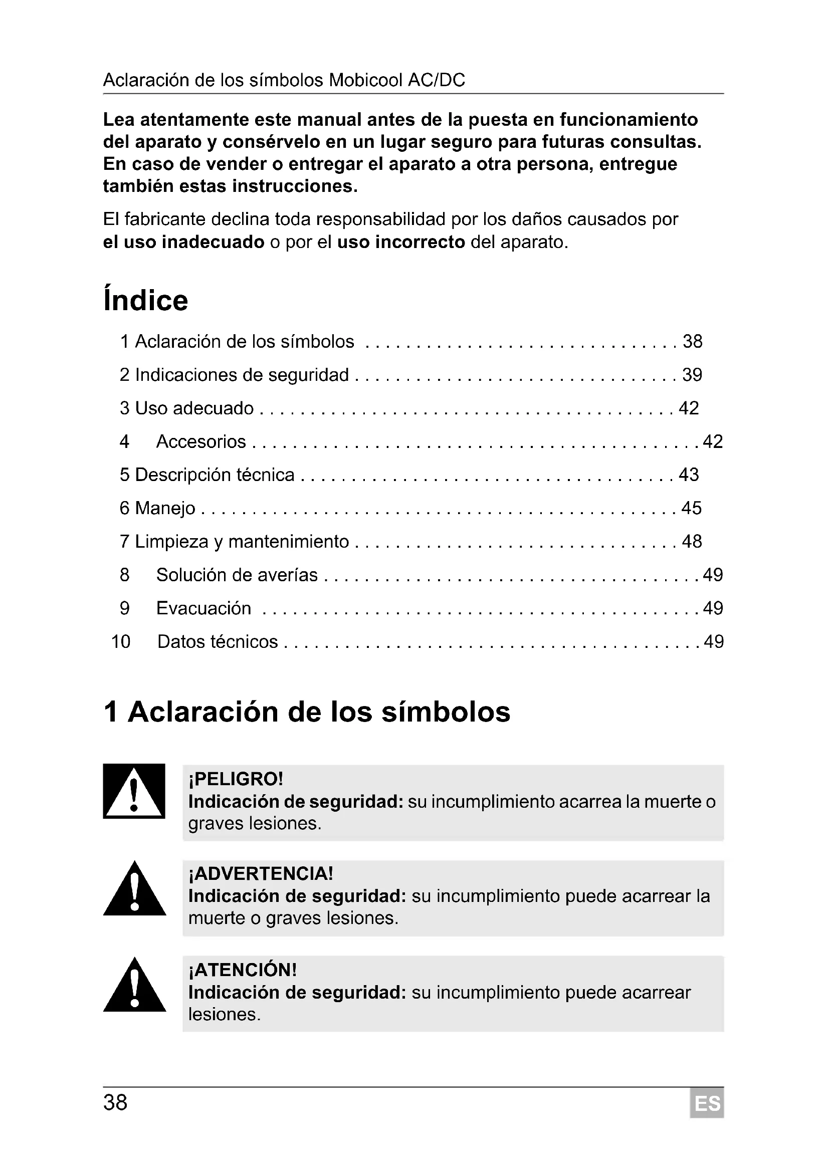 ¡PELIGRO! Indicación de seguridad: su incumplimiento acarrea la muerte o graves lesiones. ¡ADVERTENCIA! Indicación de seguridad: su incumplimiento puede acarrear la muerte o graves lesiones. ¡ATENCIÓN! Indicación de seguridad: su incumplimiento puede acarrear lesiones.ES Mobicool AC/DC Indicaciones de seguridad