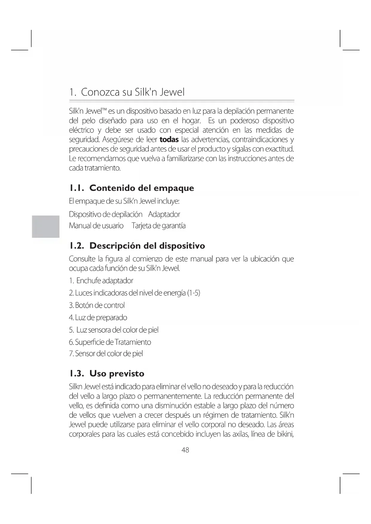 Silk'n Jewel™ es un dispositivo basado en luz para la depilacion permanente delleo disenado para uso en el hogar. Es un poderoso dispositivo eletrico y debe ser uso con especial atencion en las medias de seguridad. Aseguresse de leer todas las advertencias, contraindicaciones y precauciones de seguridad antes de user el producto y sigalias con exactitud. Le recomendamos que vuela a familiarizarse con las instrucciones antes de cada tratamento.