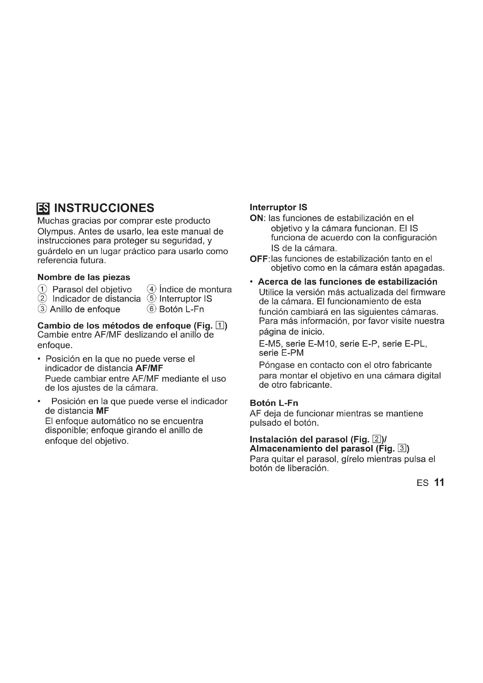 - Acerca de las funciones de estabilización Utilice la versión más actualizada del firmware de la cámara. El funcionamiento de esta función cambiará en las siguientes cámaras. Para más información, por favor visite nuestra página de inicio. E-M5, serie E-M10, serie E-P, serie E-PL, serie E-PM Póngase en contacto con el otro fabricante para montar el objetivo en una cámara digital de otro fabricante. Botón L-Fn AF deja de funcionar mientras se mantiene pulsado el botón. Instalación del parasol (Fig. 2)/ Almacenamiento del parasol (Fig. 3) Para quitar el parasol, gírelo mientras pulsa el botón de liberación. ES12 ES Notas sobre la toma fotográfica