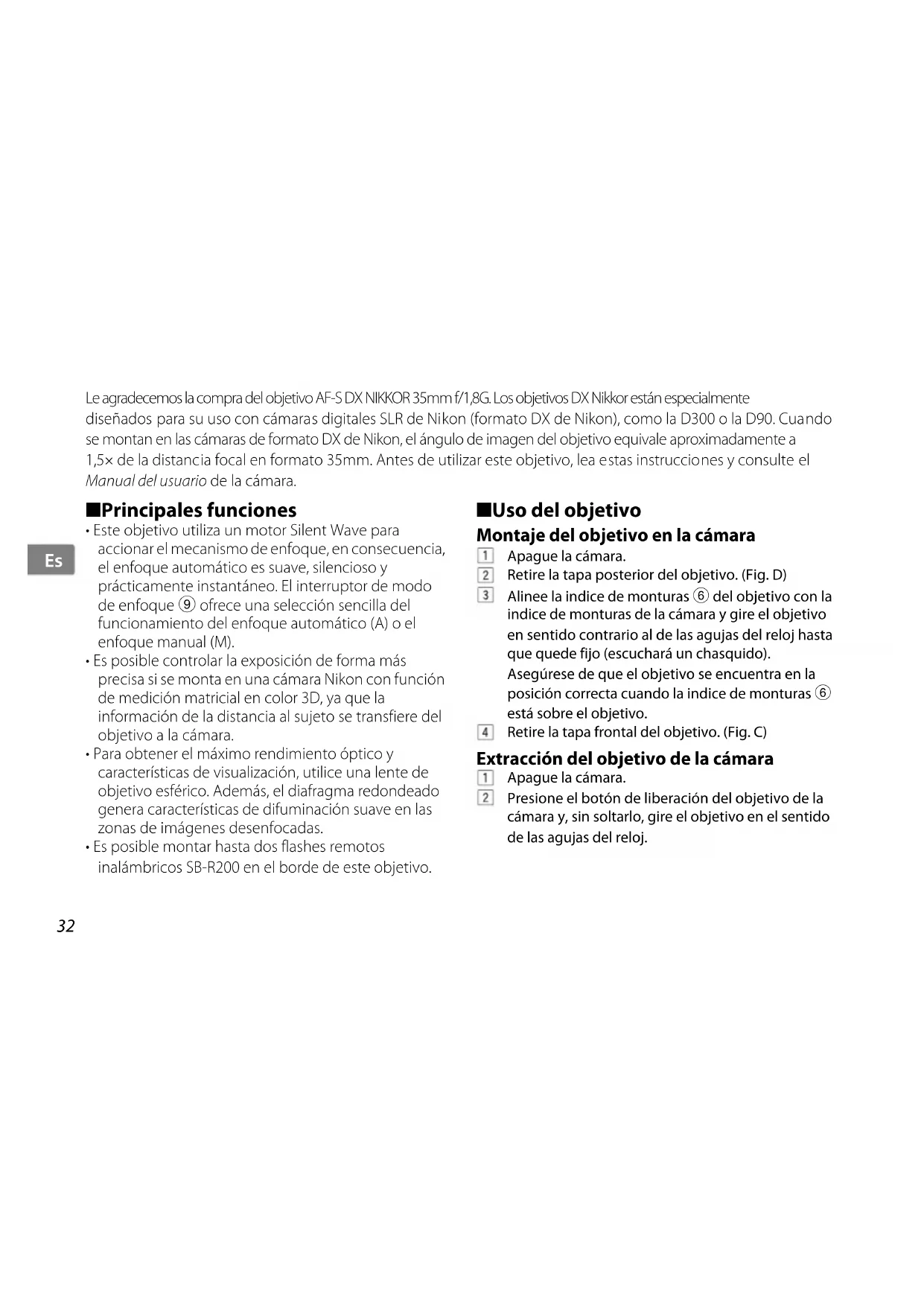 - Es posible montar hasta dos flashes remotos inalámbricos SB-R200 en el borde de este objetivo. ■ Uso del objetivo Montaje del objetivo en la cámara Apague la cámara. Retire la tapa posterior del objetivo. (Fig. D) Alinee la indice de monturas 6 del objetivo con la indice de monturas de la cámara y gire el objetivo en sentido contrario al de las agujas del reloj hasta que quede fijo (escuchará un chasquido). Asegúrese de que el objetivo se encuentra en la posición correcta cuando la indice de monturas 6 está sobre el objetivo. Retire la tapa frontal del objetivo. (Fig. C) Extracción del objetivo de la cámara Apague la cámara. Presione el botón de liberación del objetivo de la cámara y, sin soltarlo, gire el objetivo en el sentido de las agujas del reloj.33