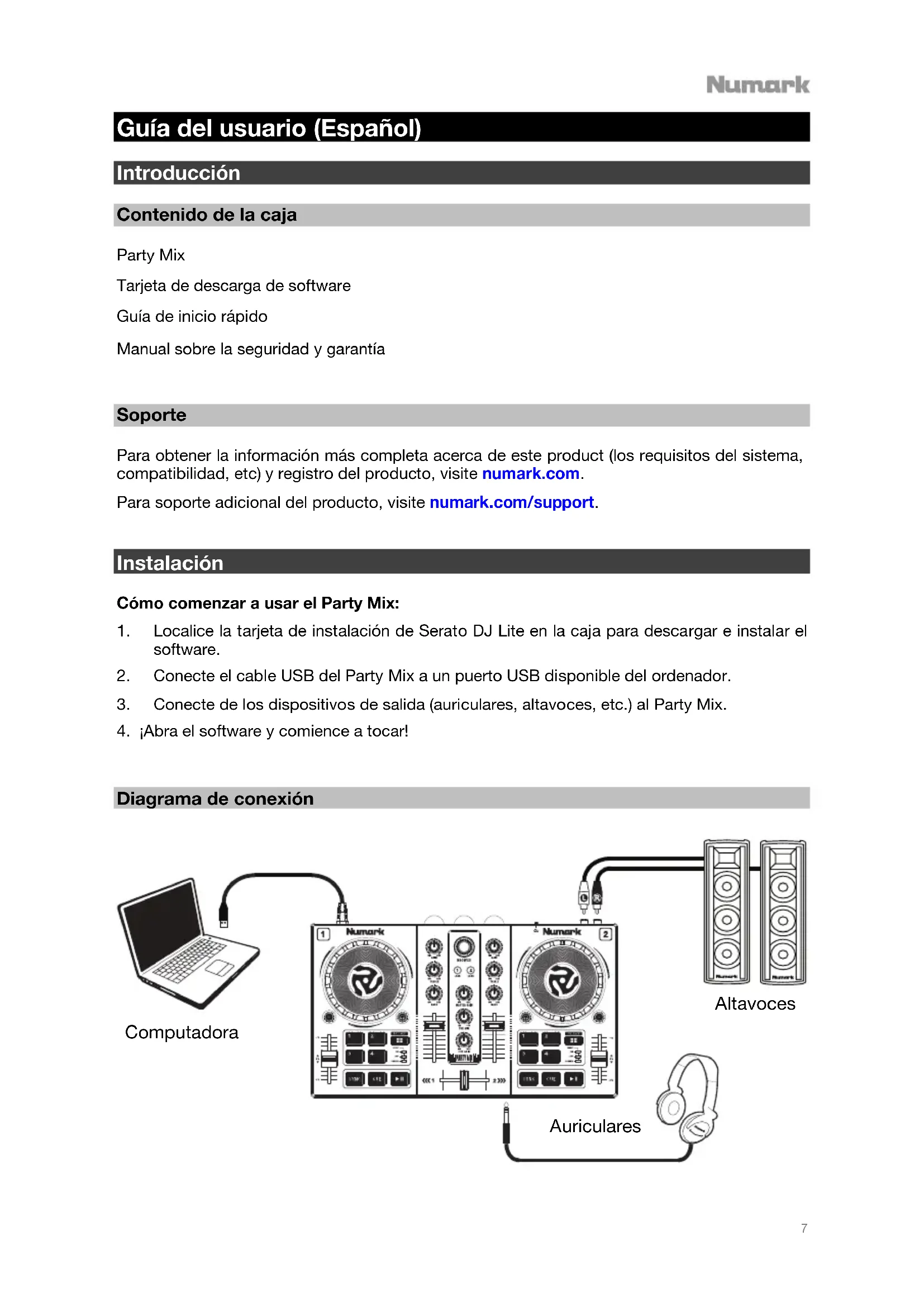 Soporte Para obtener la información más completa acerca de este product (los requisitos del sistema, compatibilidad, etc) y registro del producto, visite numark.com. Para soporte adicional del producto, visite numark.com/support.