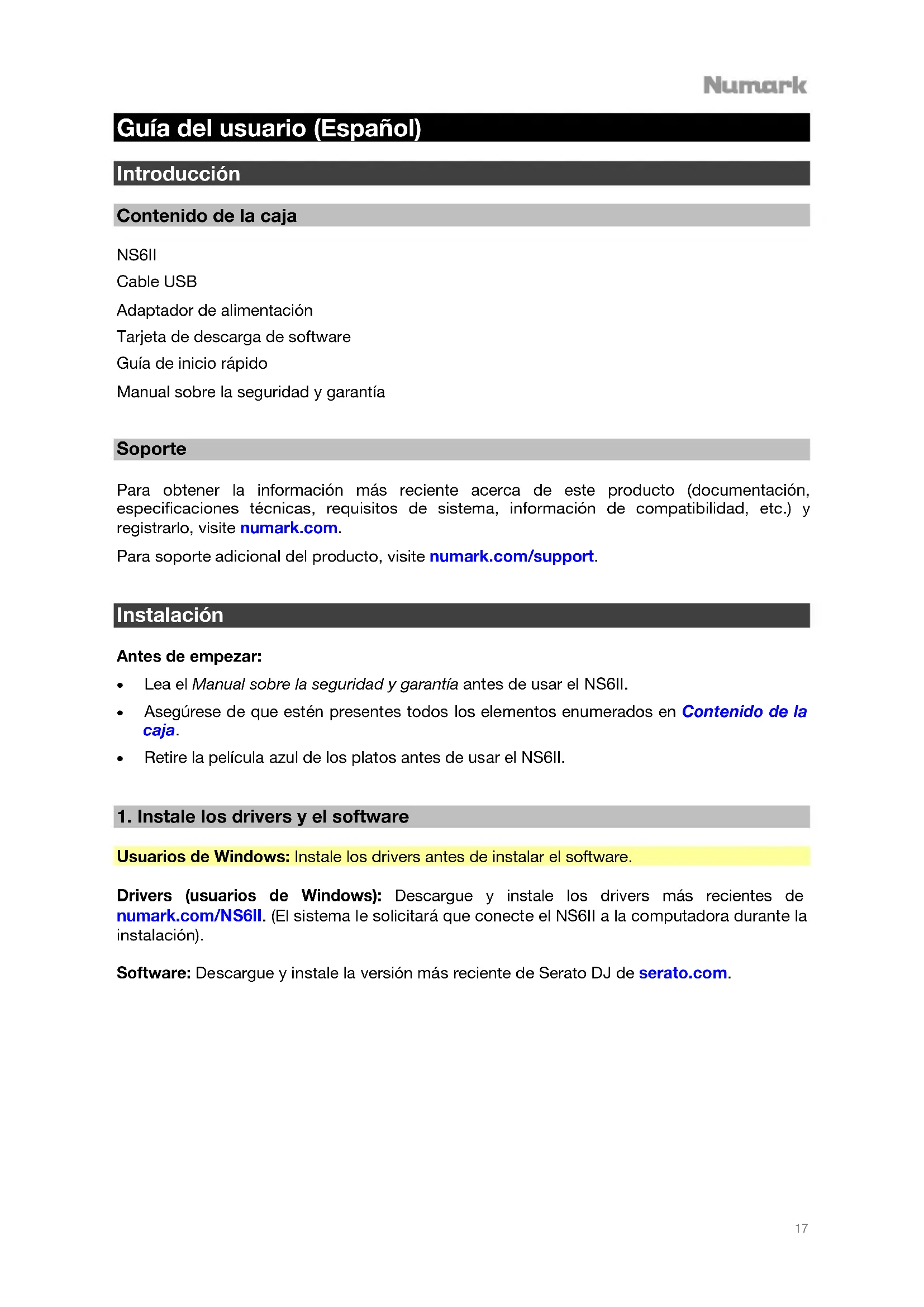 Usuarios de Windows: Instale los drivers antes de instalar el software. Drivers (usuarios de Windows): Descargue y instale los drivers más recientes de numark.com/NS6II. (El sistema le solicitará que conecte el NS6II a la computadora durante la instalación). Software: Descargue y instale la versión más reciente de Serato DJ de serato.com.18