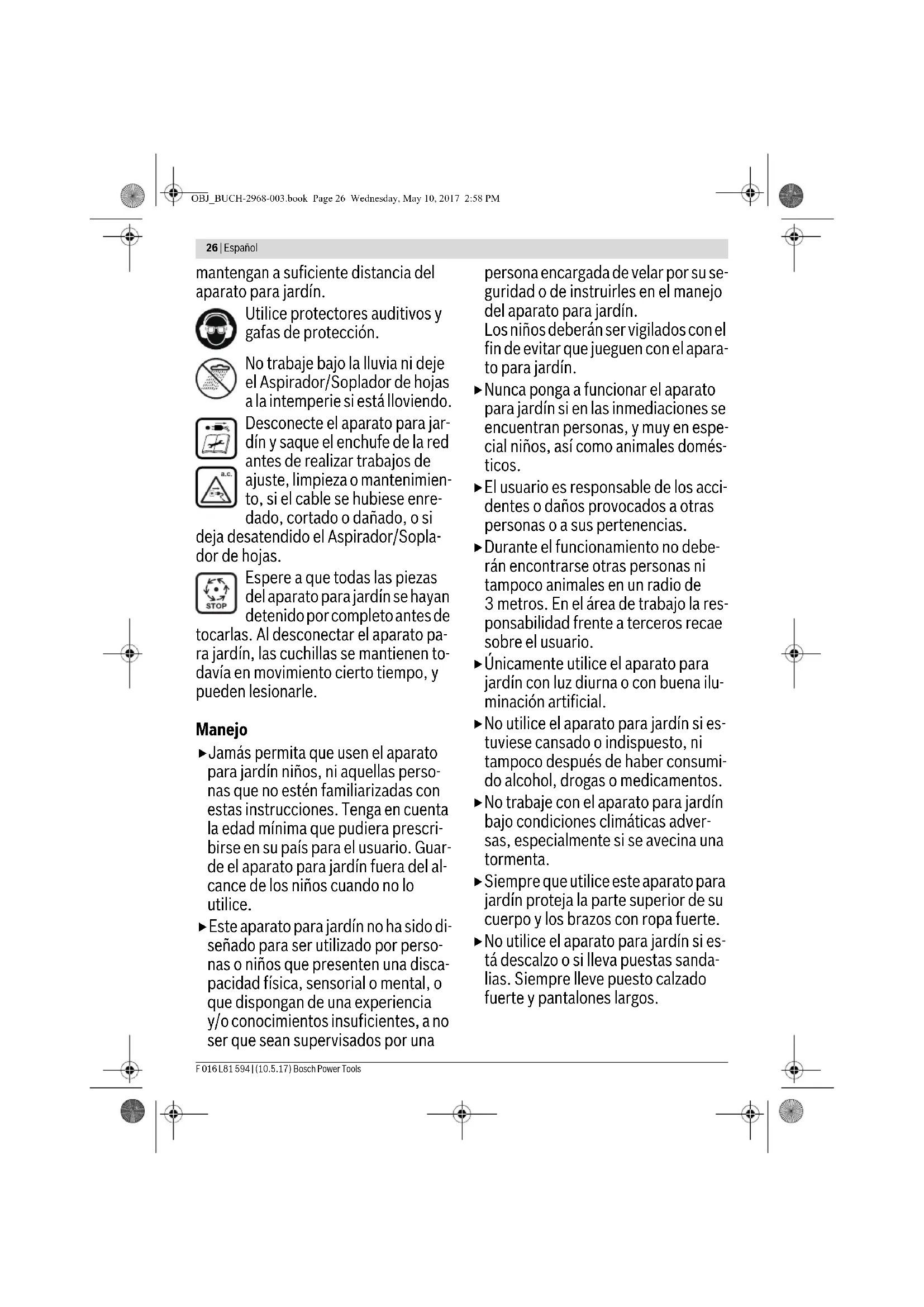 FE DE LA RED. El aparato para jardín dispone de un aislamiento de protección para su se- guridad y no precisa ser conectado a tierra. La tensión de servicio es de 230 V AC, 50 Hz (para países no perte- necientes a la CE también 220 V ó 240 V). Solamente emplear cables de prolongación homologados. Informa- OBJ_BUCH-2968-003.book Page 28 Wednesday, May 10, 2017 2:58 PMEspañol | 29 Bosch Power Tools F 016 L81 594 | (10.5.17) ciones al respecto las obtiene Ud. en su taller de servicio técnico autorizado ha- bitual. Para una mayor seguridad emplee un fusible diferencial (RCD) para una co- rriente de fuga máxima de 30 mA. Com- probar el funcionamiento correcto del fusible diferencial antes de cada uso. Mantenga los cables de red y los de pro- longación alejados de piezas móviles y preste atención a no dañarlos para evi- tar el contacto con piezas bajo tensión. Los elementos de conexión de los ca- bles (enchufes y tomas de corriente) deberán estar secos y no deberán tocar el suelo. Los cables de red y de prolongación de- berán inspeccionarse con regularidad en cuanto a posibles daños y solamente se utilizarán si se encuentran en perfec- tas condiciones. Un cable de red dañado solamente de- berá hacerse reparar en un taller de servicio autorizado Bosch. Únicamente use cables de prolonga- ción homologados. Solo use cables de prolongación, con- ductores, o tambores para cables que se correspondan con las normas EN 61242 / IEC 61242 o IEC 60884-2-7. Si precisa un cable de prolongación pa- ra trabajar con el aparato, la sección del cable deberá ser la siguiente: – Sección de cable 1,25 mm