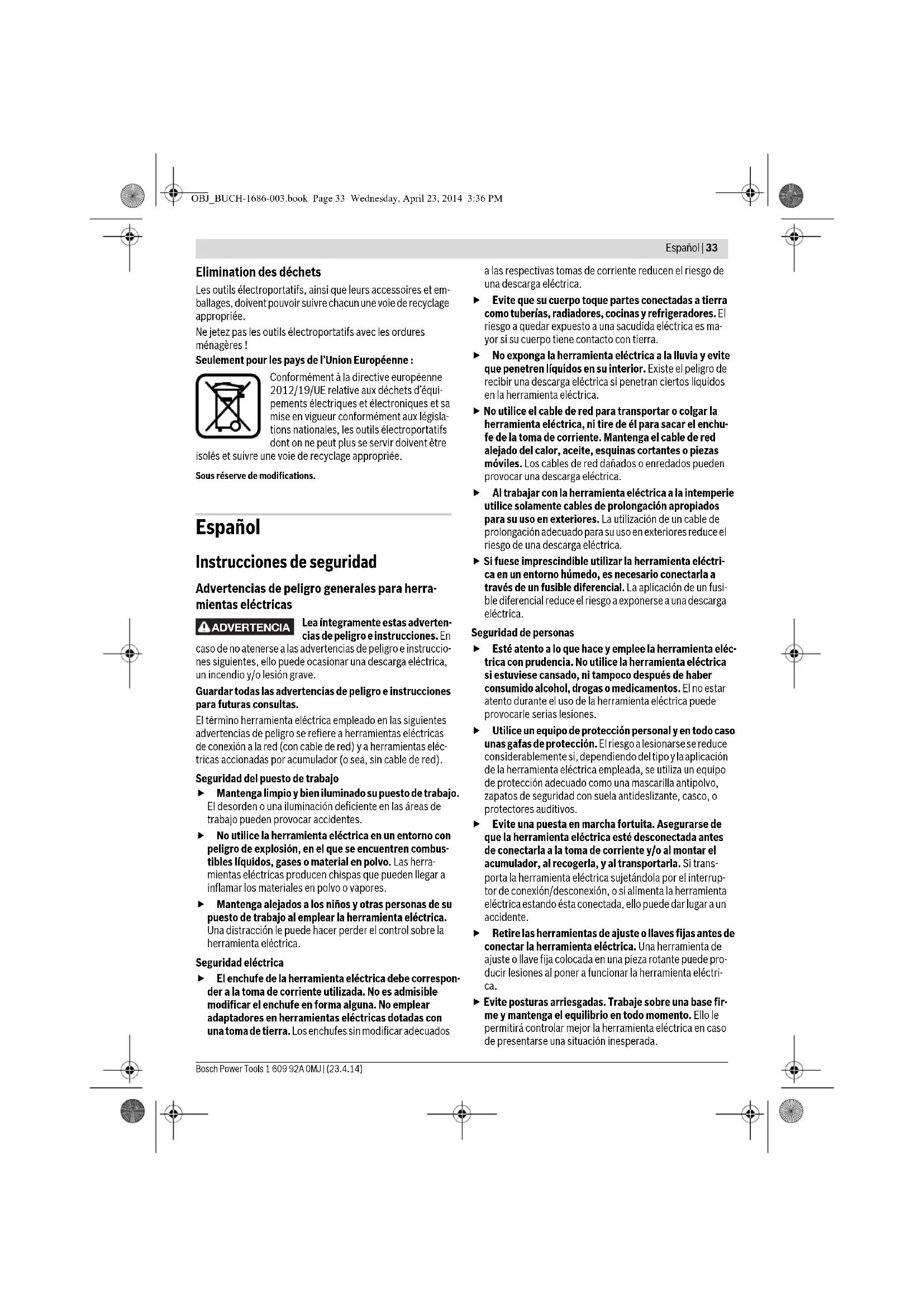 5,2 5,1 5,2 5,1 Clase de protección /II /II Estos datos son válidos para una tensión nominal de [U] 230V. Los va- lores pueden variar para otras tensiones y en ejecuciones específicas para ciertos países. Solamente en herramientas eléctricas sin limitación de la corriente de arranque: Los procesos de conexión provocan una breve caída de la ten- sión. Si las condiciones de la red fuesen desfavorables, ello puede llegar a afectar a otros aparatos. En redes con impedancias inferiores a 0,25 ohmios es improbable que lleguen a perturbarse otros aparatos. OBJ_BUCH-1686-003.book Page 37 Wednesday, April 23, 2014 3:36 PM38 | Español 1 609 92A 0MJ | (23.4.14) Bosch Power Tools Para determinar con exactitud la solicitación experimentada por las vibraciones, es necesario considerar también aquellos tiempos en los que el aparato esté desconectado, o bien, esté en funcionamiento, pero sin ser utilizado realmente. Ello pue- de suponer una disminución drástica de la solicitación por vi- braciones durante el tiempo total de trabajo. Fije unas medidas de seguridad adicionales para proteger al usuario de los efectos por vibraciones, como por ejemplo: Mantenimiento de la herramienta eléctrica y de los útiles, con- servar calientes las manos, organización de las secuencias de trabajo. Declaración de conformidad Declaramos bajo nuestra responsabilidad, que el producto descrito bajo “Datos técnicos” está en conformidad con las normas o documentos normalizados siguientes: EN 60745 de acuerdo con las disposiciones en las directivas 2011/65/UE, 2004/108/CE, 2006/42/CE. Expediente técnico (2006/42/CE) en: Robert Bosch GmbH, PT/ETM9 D-70745 Leinfelden-Echterdingen Robert Bosch GmbH, Power Tools Division D-70745 Leinfelden-Echterdingen