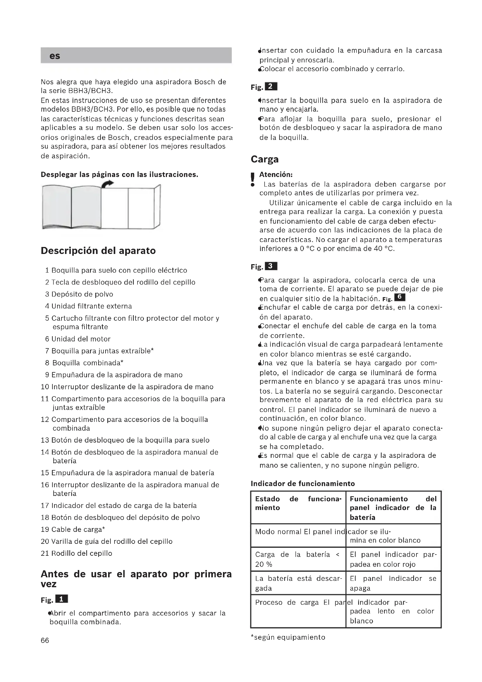 Nos alegra que haya elegido una aspiradora Bosch de la serie BBH3/BCH3. En estas instrucciones de uso se presentan diferentes modelos BBH3/BCH3. Por ello, es posible que no todas las características técnicas y funciones descritas sean aplicables a su modelo. Se deben usar solo los acces- orios originales de Bosch, creados especialmente para su aspiradora, para así obtener los mejores resultados de aspiración. Desplegar las páginas con las ilustraciones. Descripción del aparato 1 Boquilla para suelo con cepillo eléctrico 2 Tecla de desbloqueo del rodillo del cepillo 3 Depósito de polvo 4 Unidad filtrante externa 5 Cartucho filtrante con filtro protector del motor y espuma filtrante 6 Unidad del motor 7 Boquilla para juntas extraíble* 8 Boquilla combinada* 9 Empuñadura de la aspiradora de mano 10 Interruptor deslizante de la aspiradora de mano 11 Compartimento para accesorios de la boquilla para juntas extraíble 12 Compartimento para accesorios de la boquilla combinada 13 Botón de desbloqueo de la boquilla para suelo 14 Botón de desbloqueo de la aspiradora manual de batería 15 Empuñadura de la aspiradora manual de batería 16 Interruptor deslizante de la aspiradora manual de batería 17 Indicador del estado de carga de la batería 18 Botón de desbloqueo del depósito de polvo 19 Cable de carga* 20 Varilla de guía del rodillo del cepillo 21 Rodillo del cepillo Antes de usar el aparato por primera vez Fig.