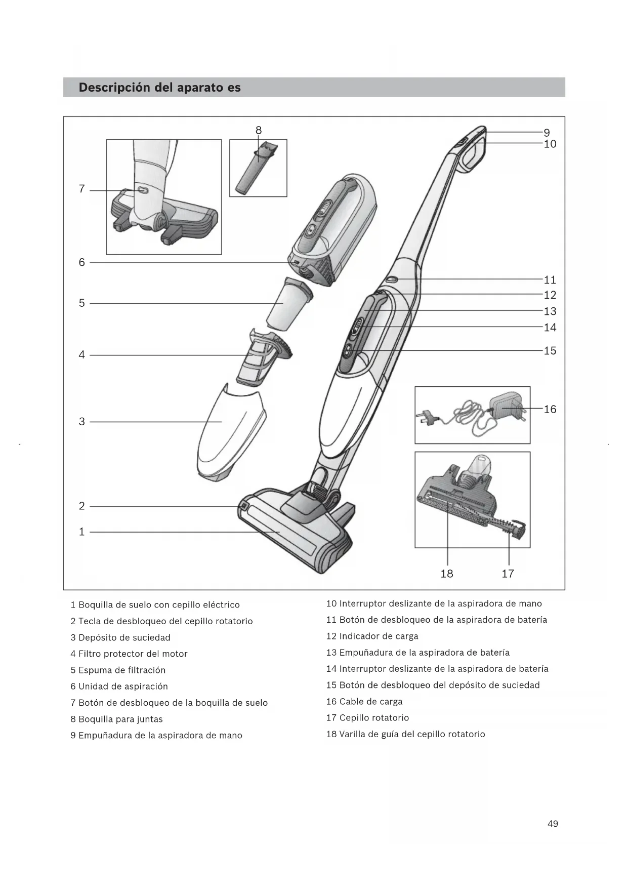 fi49 Descripción del aparato es 1 Boquilla de suelo con cepillo eléctrico 2 Tecla de desbloqueo del cepillo rotatorio 3 Depósito de suciedad 4 Filtro protector del motor 5 Espuma de filtración 6 Unidad de aspiración 7 Botón de desbloqueo de la boquilla de suelo 8 Boquilla para juntas 9 Empuñadura de la aspiradora de mano 10 Interruptor deslizante de la aspiradora de mano 11 Botón de desbloqueo de la aspiradora de batería 12 Indicador de carga 13 Empuñadura de la aspiradora de batería 14 Interruptor deslizante de la aspiradora de batería 15 Botón de desbloqueo del depósito de suciedad 16 Cable de carga 17 Cepillo rotatorio 18 Varilla de guía del cepillo rotatorio