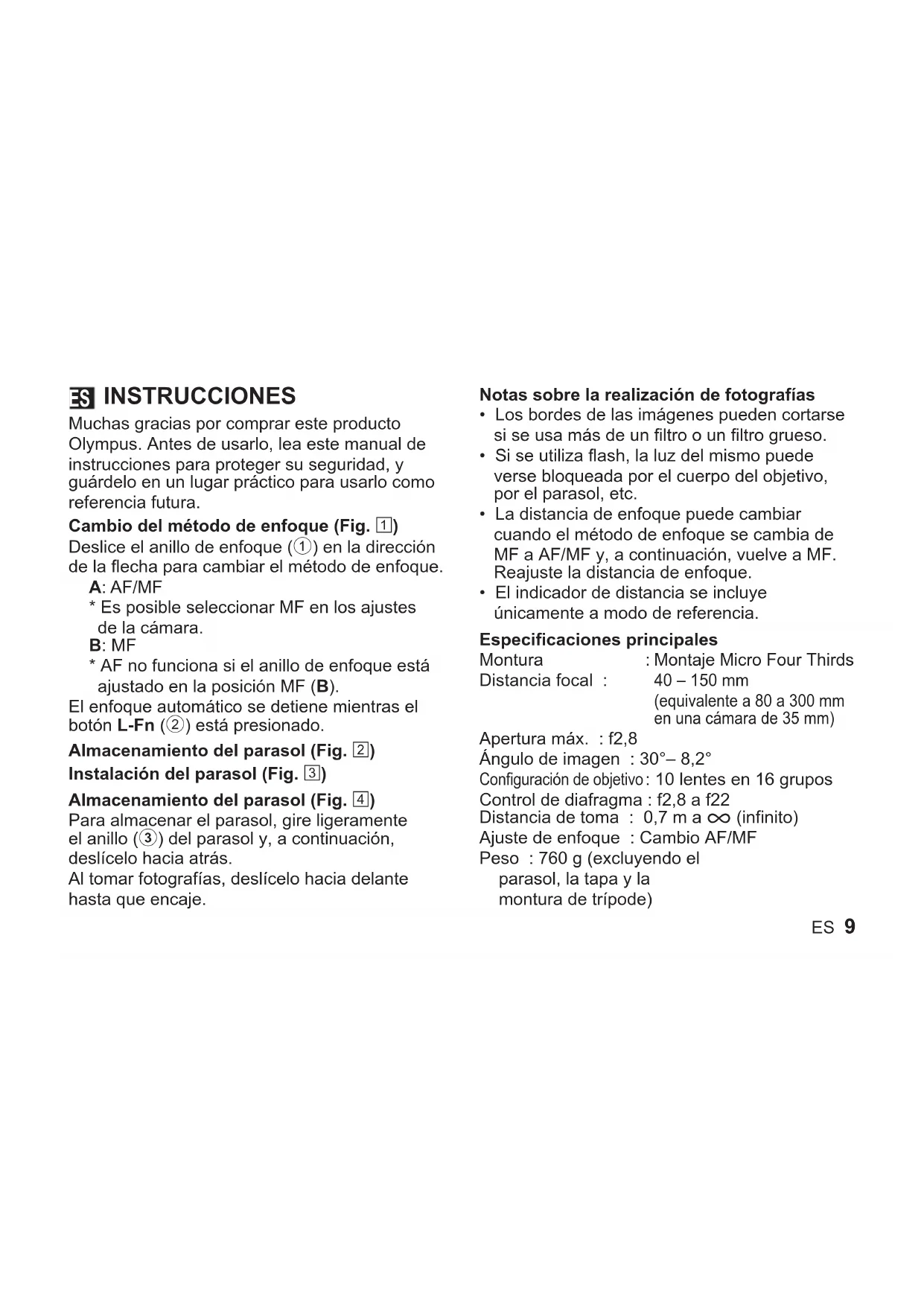 - El indicador de distancia se incluye únicamente a modo de referencia. Especificaciones principales Montura : Montaje Micro Four Thirds Distancia focal : 40 – 150 mm (equivalente a 80 a 300 mm en una cámara de 35 mm) Apertura máx. : f2,8 Ángulo de imagen : 30°– 8,2° Configuración de objetivo : 10 lentes en 16 grupos Control de diafragma : f2,8 a f22 Distancia de toma : 0,7 m a ) (infinito) Ajuste de enfoque : Cambio AF/MF Peso : 760 g (excluyendo el parasol, la tapa y la montura de trípode) ES10 ES Medidas : Diámetro máximo Ø 79,4 × longitud