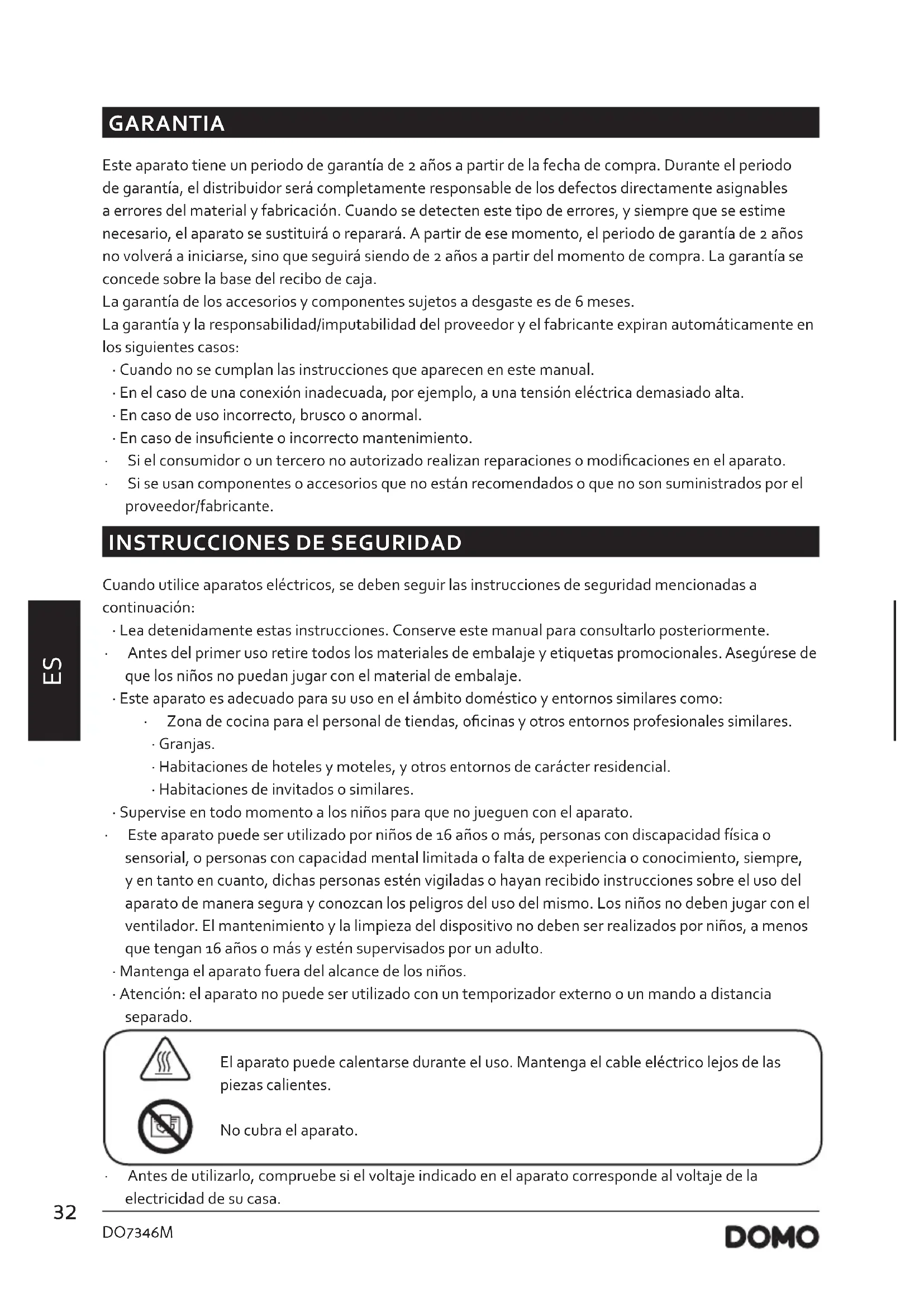 ENVIRONMENTAL GUIDELINES This symbol on the product or on its packaging indicates that this product may not be treated as household waste. Instead it must be brought to the applicable collection point for recycling of electrical and electronic equipment. By ensuring this product is disposed of correctly, you will help prevent potential negative consequences for the environment and human health, which could otherwise be caused by inappropriate waste handling of this product. For more detailed information about recycling of this product, please contact your local city oce, your household waste disposal service or the shop where you purchased the product. The packaging is recyclable. Please treat the packaging ecologically.32 DO7346M GARANTIAEste aparato tiene un periodo de garantía de 2 años a partir de la fecha de compra. Durante el periodo de garantía, el distribuidor será completamente responsable de los defectos directamente asignables a errores del material y fabricación. Cuando se detecten este tipo de errores, y siempre que se estime necesario, el aparato se sustituirá o reparará. A partir de ese momento, el periodo de garantía de 2 años no volverá a iniciarse, sino que seguirá siendo de 2 años a partir del momento de compra. La garantía se concede sobre la base del recibo de caja.La garantía de los accesorios y componentes sujetos a desgaste es de 6 meses.La garantía y la responsabilidad/imputabilidad del proveedor y el fabricante expiran automáticamente en los siguientes casos: · Cuando no se cumplan las instrucciones que aparecen en este manual. · En el caso de una conexión inadecuada, por ejemplo, a una tensión eléctrica demasiado alta. · En caso de uso incorrecto, brusco o anormal. · En caso de insuciente o incorrecto mantenimiento.