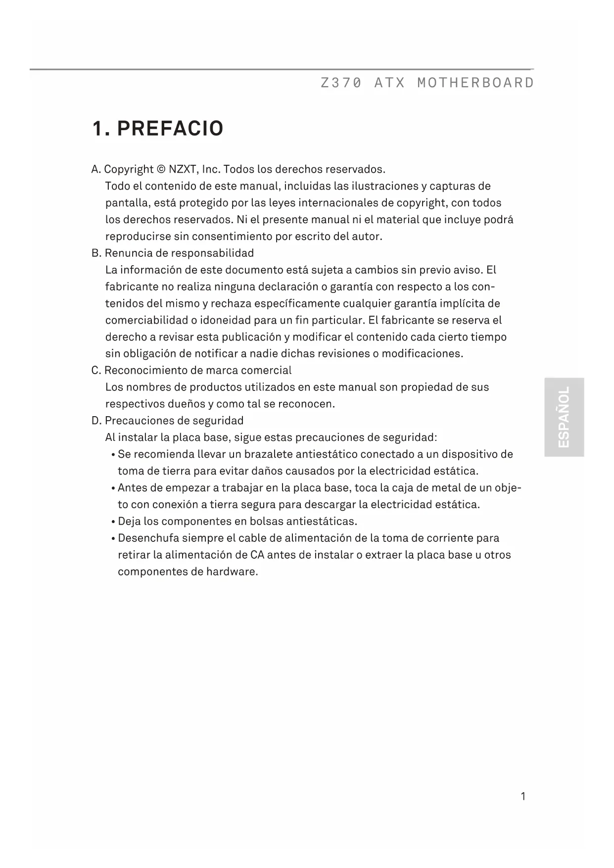 A. Copyright © NZXT, Inc. Todos los derechos reservados. Todo el contenido de este manual, incluidas las ilustraciones y capturas de pantalla, está protegido por las leyes internacionales de copyright, con todos los derechos reservados. Ni el presente manual ni el material que incluye podrá reproducirse sin consentimiento por escrito del autor. B. Renuncia de responsabilidad La información de este documento está sujeta a cambios sin previo aviso. El fabricante no realiza ninguna declaración o garantía con respecto a los con- tenidos del mismo y rechaza específicamente cualquier garantía implícita de comerciabilidad o idoneidad para un fin particular. El fabricante se reserva el derecho a revisar esta publicación y modificar el contenido cada cierto tiempo sin obligación de notificar a nadie dichas revisiones o modificaciones. C. Reconocimiento de marca comercial Los nombres de productos utilizados en este manual son propiedad de sus respectivos dueños y como tal se reconocen. D. Precauciones de seguridad Al instalar la placa base, sigue estas precauciones de seguridad: Se recomienda llevar un brazalete antiestático conectado a un dispositivo de toma de tierra para evitar daños causados por la electricidad estática. Antes de empezar a trabajar en la placa base, toca la caja de metal de un obje- to con conexión a tierra segura para descargar la electricidad estática. Deja los componentes en bolsas antiestáticas. Desenchufa siempre el cable de alimentación de la toma de corriente para retirar la alimentación de CA antes de instalar o extraer la placa base u otros componentes de hardware.