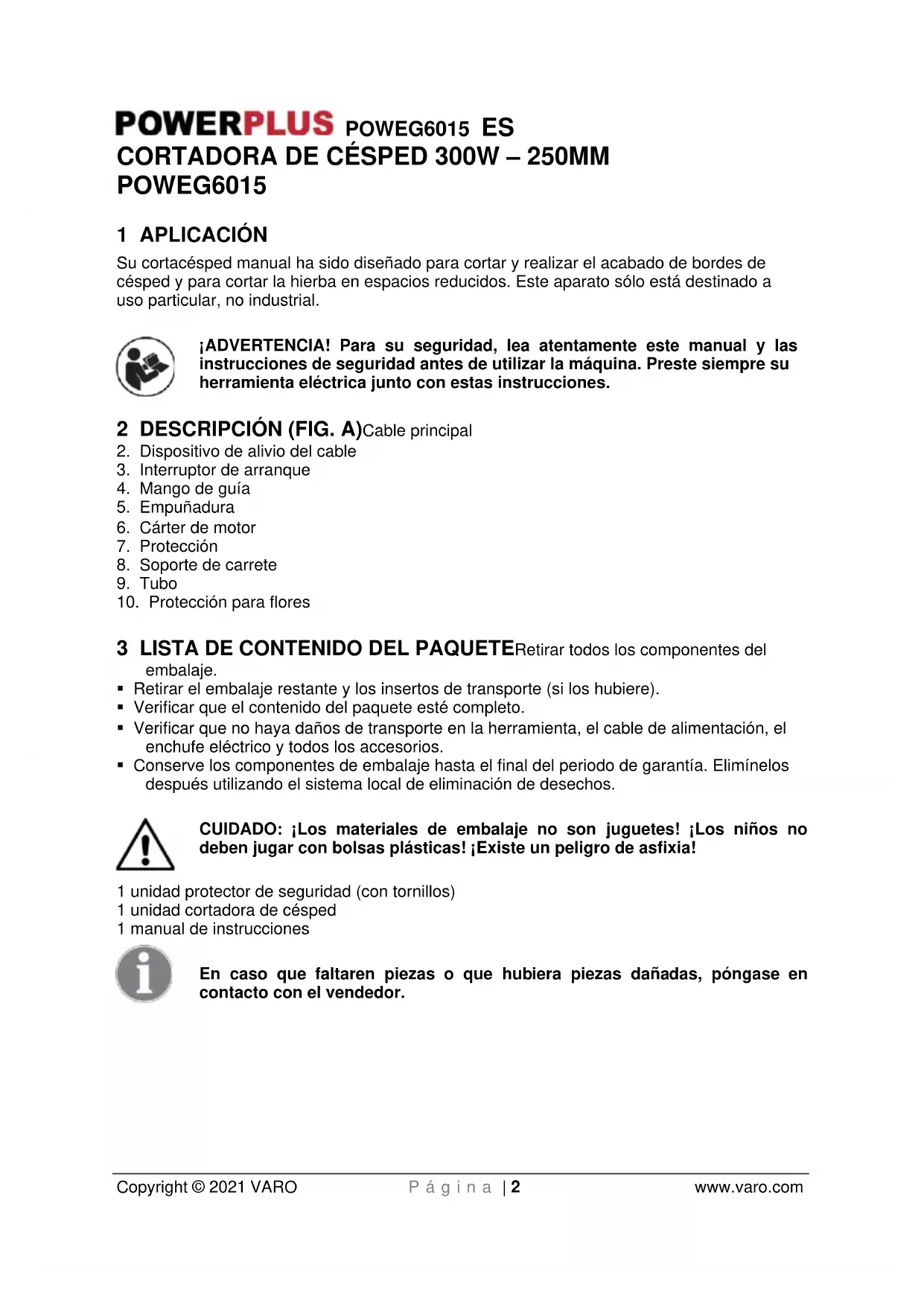 - No almacene la cortadora de césped directamente sobre el suelo. Cuélguela por la empuñadura de manera que la protección no toque nada. Colocar la protección sobre una superficie puede alterar el filo y por consiguiente modificar sus dimensiones y características de seguridad.POWEG6015 ES Copyright © 2021 VARO P á g i n a | 9 www.varo.com 13 GARANTÍAEste producto está garantizado, de acuerdo con la normativa legal, por un periodo de 24 meses, efectivos desde la fecha de compra por el primer usuario.