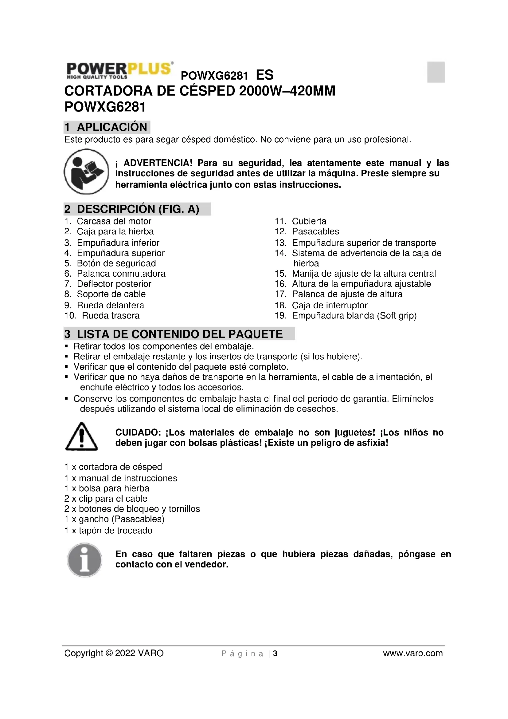 - Nunca coja ni traslade la cortadora de césped mientras el motor está funcionando.POWXG6281 ES Copyright © 2022 VARO P á g i n a | 8 www.varo.com