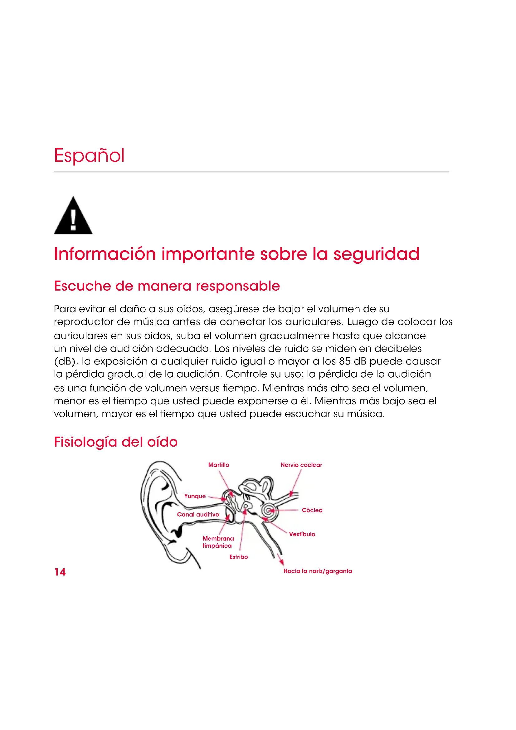 - La información del cuadro se obtuvo de http://www.nidcd.nih.gov/health/education/teachers/pages/common_sounds.aspx En este cuadro de decibeles (dB) se compara algunos sonidos comunes y se muestra la clasicación según el daño potencial que sufre la audición.16 Español ”…. una persona normal puede escuchar música de un iPod de manera segura durante 4,6 horas al día con el volumen subido al 70%”. ”…. conocer los niveles a los que uno escucha música y durante cuánto tiempo es muy importante”. De http://www.cbc.ca/health/story/2006/10/19/music-earphones.html Obtenga el mayor benecio de su equipo y disfrute un excelente rendimiento de audio aun a niveles seguros. Nuestros auriculares le permitirán oír más detalles a niveles de volumen más bajos que antes. Uso responsable No use los auriculares cuando no sea seguro hacerlo, como al operar un vehículo, cruzar las calles o durante una actividad o en un ambiente donde se requiera que preste atención completa a su alrededor. Es peligroso conducir usando auriculares, y en muchos lugares, es ilegal porque disminuye sus opciones de escuchar sonidos fuera de su vehículo que pueden salvarle la vida, como la bocina de otro auto y las sirenas de vehículo de emergencia. Por favor evite usar sus auriculares mientras conduce. En lugar de eso, use un transmisor FM para escuchar sus dispositivos de medios móviles. Aprenda más sobre cómo establecer un nivel de audición seguro y revise otras guías de seguridad importantes de la Asociación de Consumidores de Electrónicos en www.ce.org y la Fundación para la Investigación de la Sordera en www.drf.org.17 Uso del micrófono remoto Los auriculares Beats Pro vienen equipados con un cable de audio que tiene una aplicación de micrófono remoto incorporado para el uso con teléfono o reproductor de música. Español Las funciones incluyen: