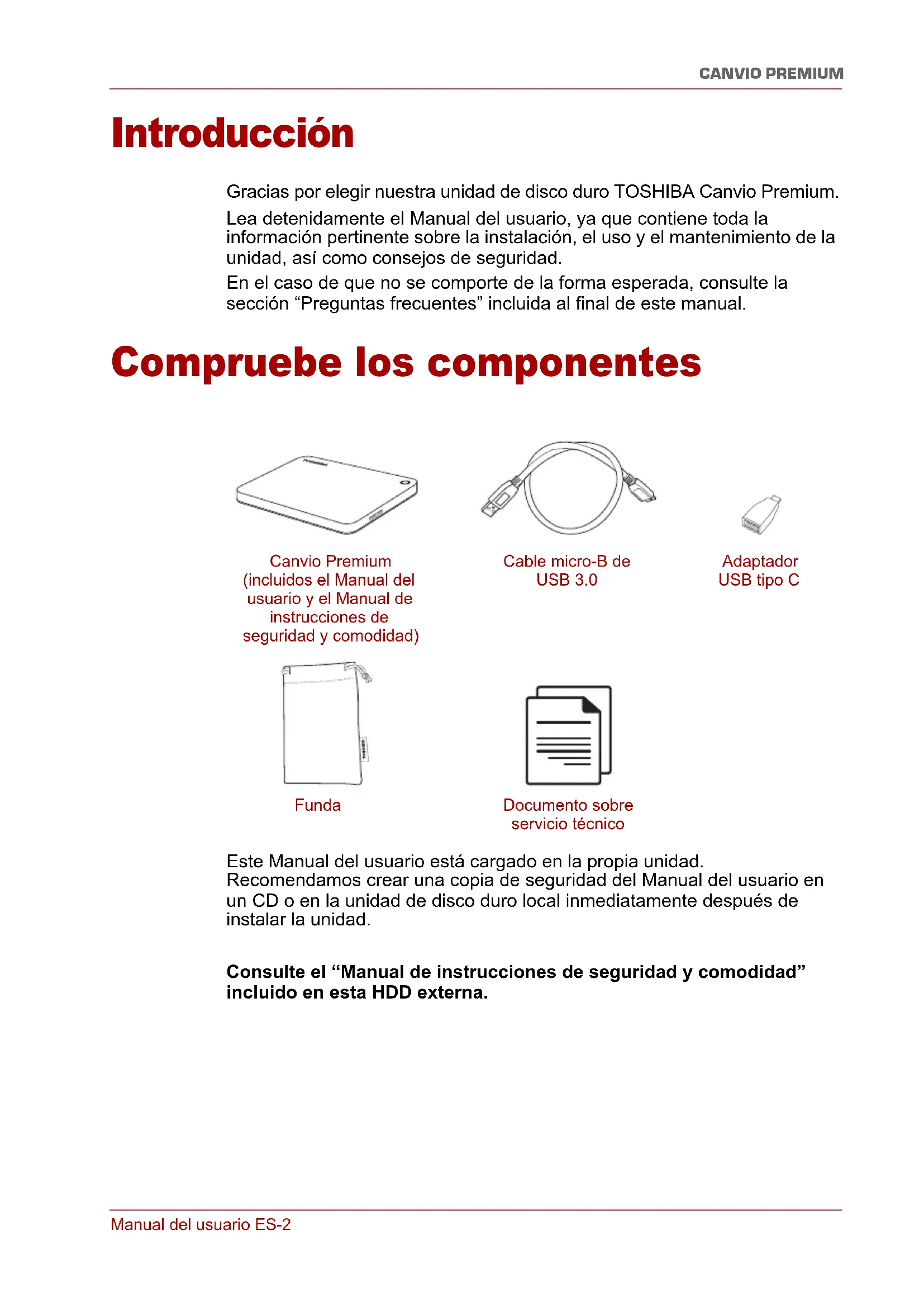 ) es inferior a la capacidad declarada real de la unidad? R: Esta diferencia se debe a los diferentes métodos de cálculo de la capacidad. Los fabricantes de unidades de disco duro calculan empleando el sistema decimal, mientras que el sistema operativo calcula empleando el sistema binario. Ejemplo decimal: 1 TB = 1.000 GB 1 GB = 1.000 MB = 1.000.000 KB = 1.000.000.000 bytes Ejemplo binario: 1 GB = 1.024 MB = 1.048.576 KB = 1.073.741.824 bytes Como resultado, un disco duro de 1 TB (en el sistema decimal) aparece en Windows como si solo tuviera 931 GB (en el sistema binario). P: ¿Puedo usar la unidad para copiar un sistema operativo de un ordenador a otro? R: No, debe seguir las instrucciones de instalación del proveedor del sistema operativo. No basta con realizar una simple copia. P: ¿Ofrece Toshiba servicios de recuperación de datos? R: Sí, Toshiba ofrece un servicio de recuperación de datos de unidades de disco duro externas. Consulte nuestra web www.toshiba-europe.com/services para obtener más información sobre este servicio.Manual del usuario ES-7 CANVIO PREMIUM Solución de problemas Mi ordenador no reconoce la unidad de disco. ■ Asegúrese de que se hayan establecido correctamente todas las conexiones. ■ Si la unidad está conectada a través de un concentrador USB, asegúrese de que dispone de fuente de alimentación propia. ■ Si utiliza una tarjeta complementaria, asegúrese de que ésta funciona correctamente y actualice el software/firmware. ¿Es peligroso que la unidad se caliente durante su funcionamiento? R: Esto es normal y, por tanto, no es peligroso. La unidad emite el mensaje "No se puede iniciar el dispositivo.” R: Existen dos motivos posibles. Puede ser un problema de alimentación, que exigirá comprobar las conexiones, o que la unidad tenga un problema de funcionamiento y necesite reparación. No veo la unidad en “Mi PC”, aunque sí aparece en el Administrador de dispositivos. R: Siga estas instrucciones: