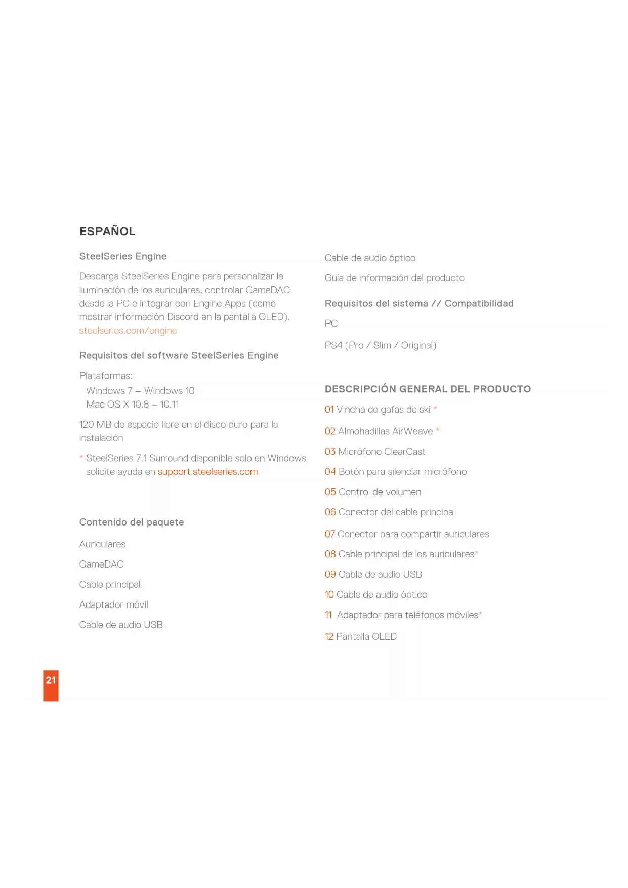 - SteelSeries 7.1 Surround disponible solo en Windows solicite ayuda en support.steelseries.com Contenido del paquete Auriculares GameDAC Cable principal Adaptador móvil Cable de audio USB Cable de audio óptico Guía de información del producto Requisitos del sistema // Compatibilidad