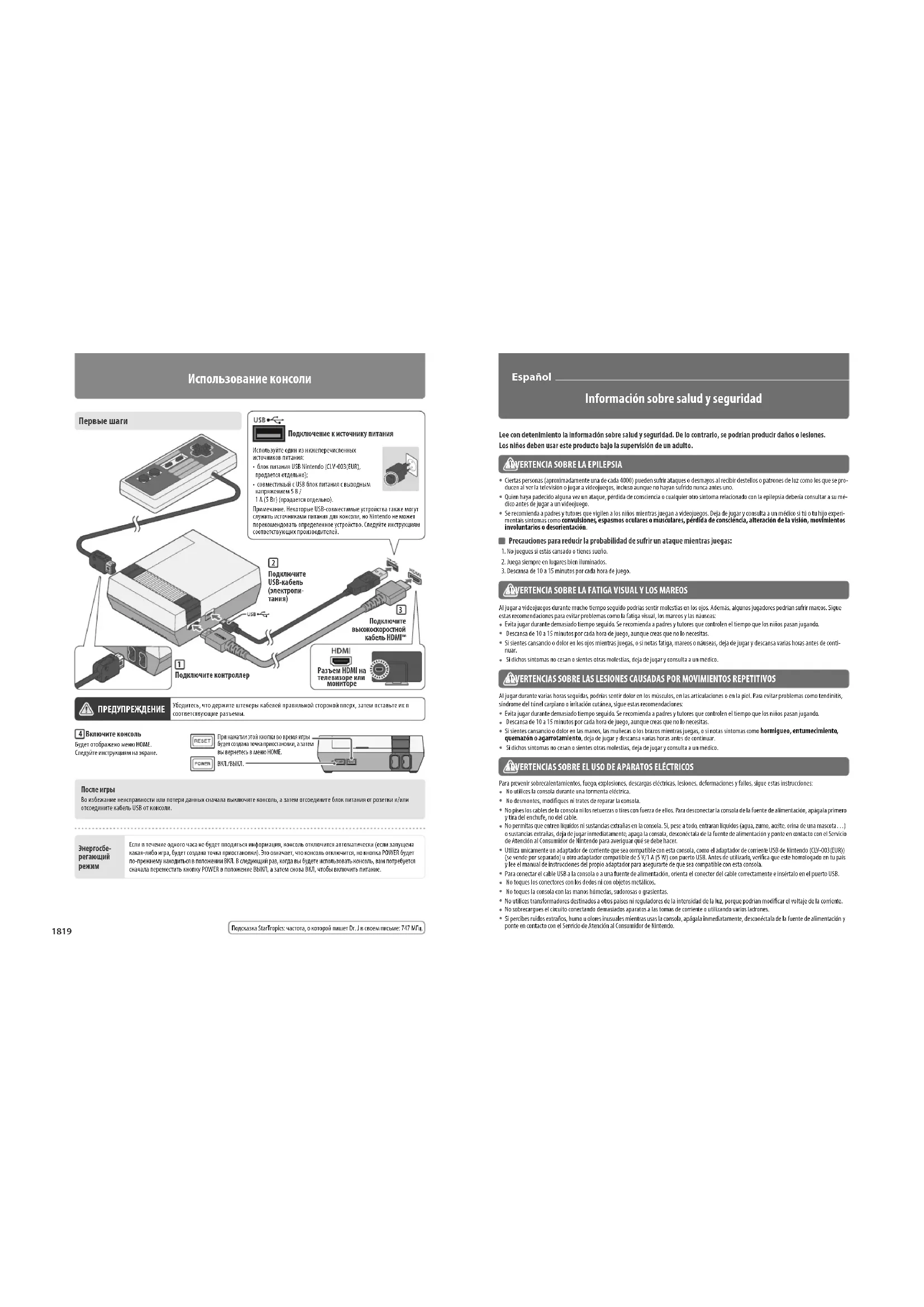 Включите консольБудет отображено меню HOME. Следуйте инструкциям на экране.После игры Во избежание неисправности или потери данных сначала выключите консоль, а затем отсоедините блок питания от розетки и/или отсоедините кабель USB от консоли.Если в течение одного часа не будет вводиться информация, консоль отключится автоматически (если запущена какая-либо игра, будет создана точка приостановки). Это означает, что консоль отключится, но кнопка POWER будет по-прежнему находиться в положении ВКЛ. В следующий раз, когда вы будете использовать консоль, вам потребуется сначала переместить кнопку POWER в положение ВЫКЛ, а затем снова ВКЛ, чтобы включить питание.Энергосбе-регающий режимПри нажатии этой кнопки во время игры будет создана точка приостановки, а затем вы вернетесь в меню HOME.ВКЛ./ВЫКЛ.20 21 ADVERTENCIAS GENERALES Este producto no es apto para niños pequeños (riesgo de estrangulamiento). El cable del mando podría enrollarse en el cuello. Mantén la consola lejos del alcance de niños pequeños y mascotas. Los niños pequeños podrían meterse en la boca los cables u otros accesorios y causarse lesiones. Desecha el embalaje inmediatamente después de haber desempaquetado el producto. Los niños pequeños podrían tragarse por accidente el em- balaje. Usa la consola con cuidado No utilices ni guardes la consola en lugares húmedos o donde haga calor, por ejemplo: en lugares expuestos a la luz directa del sol; en lugares próximos a fuentes de calor, como radiadores y fuegos de cocina; sobre una manta eléctrica o una alfombra de bra larga; sobre aparatos de música o vídeo; en lugares sin ventilación, como el interior de un vehículo en días de calor. No utilices ni guardes la consola en zonas donde se acumule polvo, gases o humo de tabaco. Si se acumula polvo u otra sustancia extraña en los terminales o conectores de la consola o en los cables, límpialos con un aspirador, una gamuza seca u otro producto adecuado. No utilices ni coloques la consola en lugares donde se produzcan cambios bruscos de temperatura que puedan provocar la condensación de agua, como junto a aparatos de aire acondicionado. Si se condensara agua sobre la consola, apágala y deja que las gotas se evaporen. La consola es únicamente para interiores. No ejerzas demasiada fuerza sobre la consola. No fuerces los cables ni otros accesorios al conectarlos. Utiliza únicamente accesorios compatibles. Si la consola está dañada, ponte en contacto con el Servicio de Atención al Consumidor. No toques las zonas dañadas y evita el contacto con líquidos procedentes de fugas. Cómo utilizar la consola Pista de StarTropics: la frecuencia oculta en la carta del Dr. J es 747 MHz. Información básica Conecta el cable HDMI™ de alta velocidad.Conecta el cable USB (alimentación).Puerto HDMI del televisor o monitorConecta el mando.